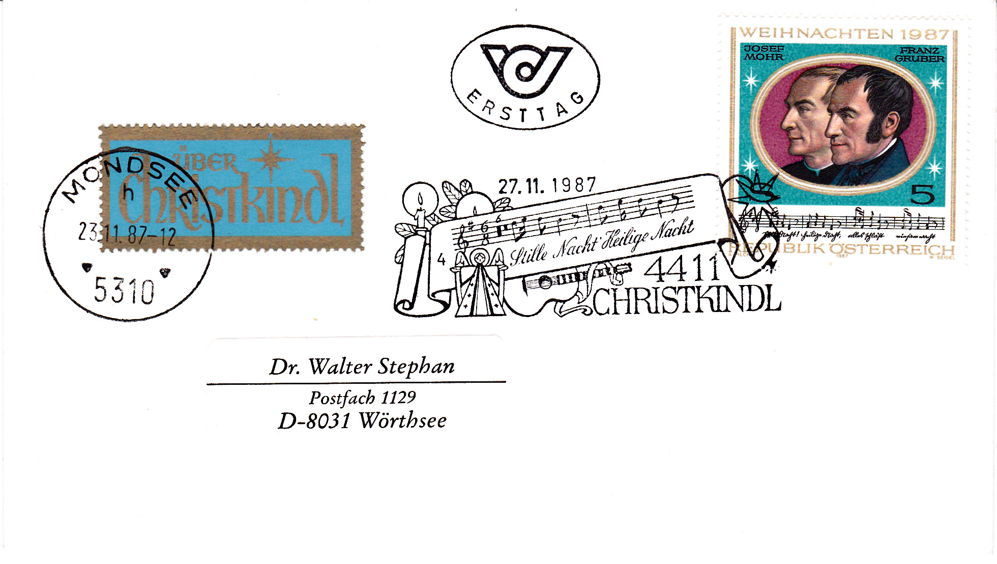 Ein weiterer Sonderstempel Christkindl vom 27.11.1987 mit der Kennziffer "5" und wurde auf einem am 26.11.1987 in Stad-Paura aufgegebenen Umschlag mit dem Leitzettel "Über Christkindl" angebracht.