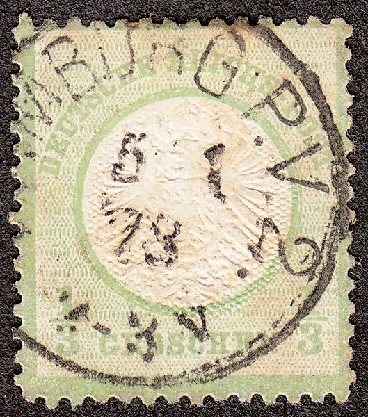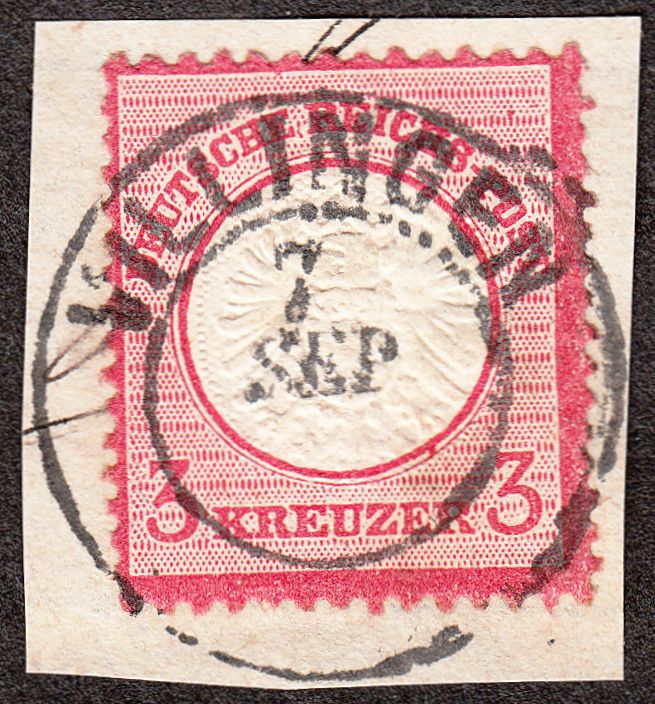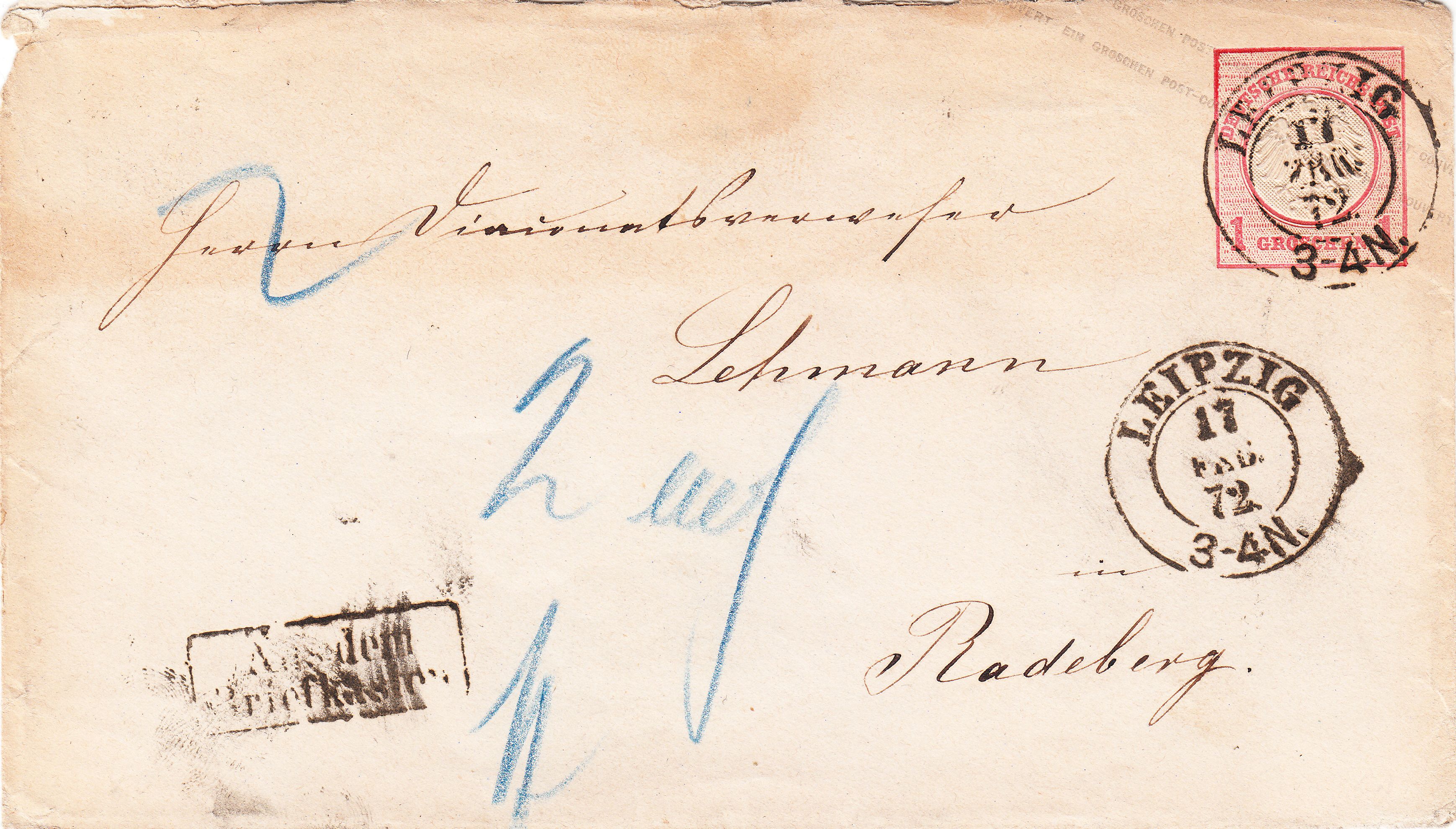 Diese Ganzsache U 1 I A wurde am 17.02.1872 entwertet per nachverwendetem sächsischem Zweikreisstempel LEIPZIG: