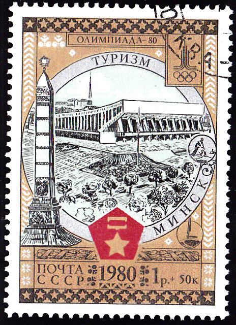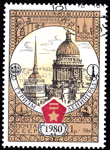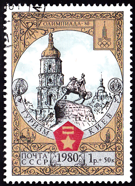 Am 30.4.1980 ist der vierte Teil dieser Serie mit Motiven zum "Tourismus" erschienen. Diese Marke (MiNr 4949) zeigt das Reiterdenkmal Bogdan Chmelnizkij vor dem Höhlenkloster mit der Sophienkathedrale in Kiew.