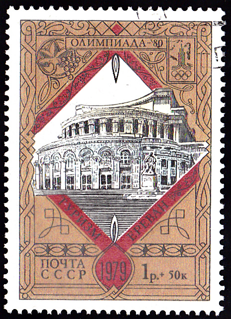 Auf der letzten Marke dieser Serie aus dem Jahre 1979 sehen wir das Opern- und Balletttheater "Spendiarow" (erbaut 1926-1939) in Erewan.