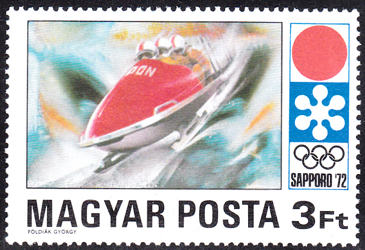 Auf dieser Marke zu den Winterspielen 1972 aus Ungarn (MiNr 2726 A) wird ein Viererbob gezeigt.