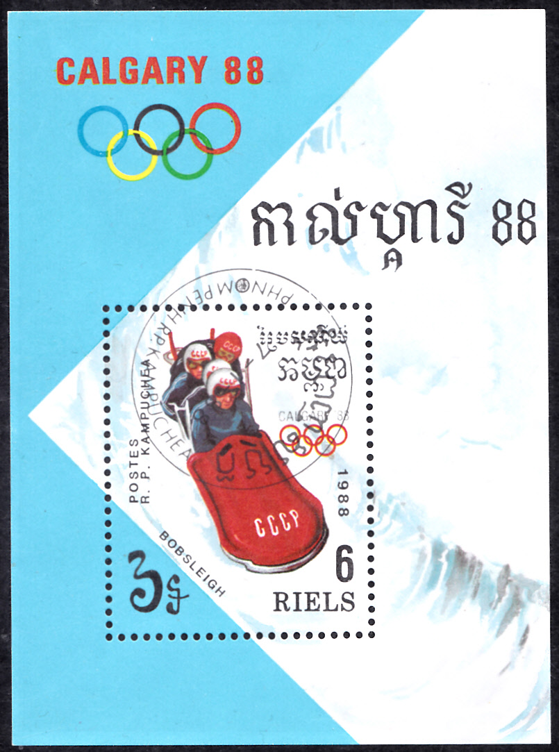 Dieser Block aus Kambodscha zu den Winterspielen 1988 (MiNr Block 156 mit Marke MiNr 918) zeigt einen Viererbob.