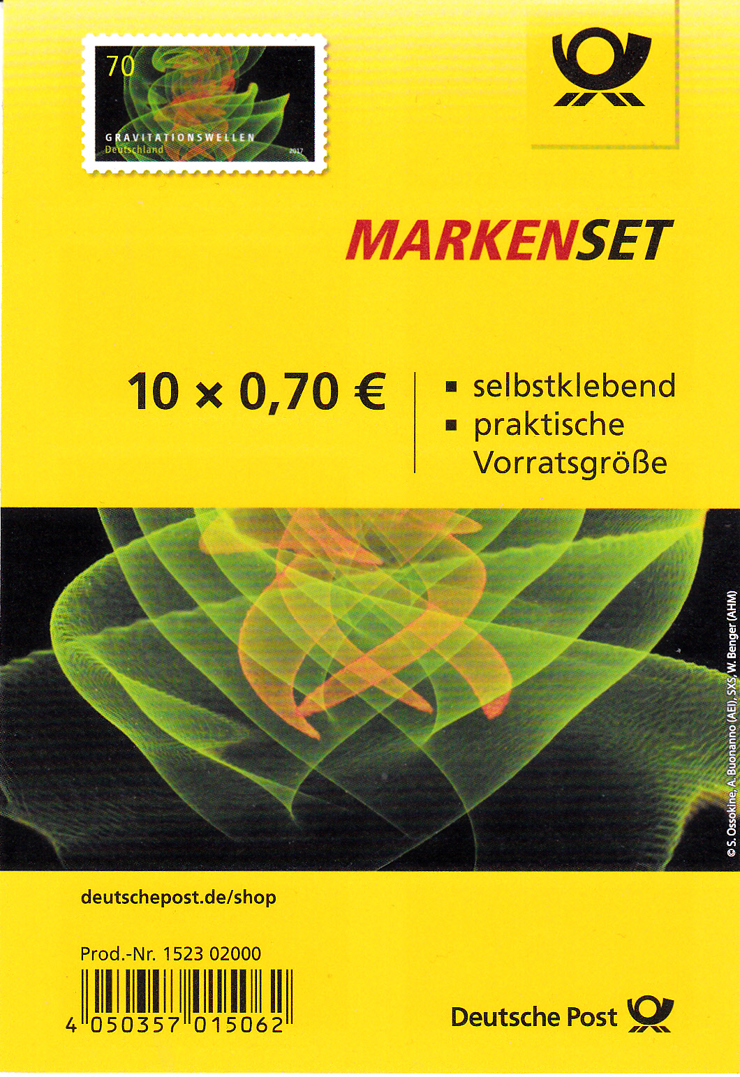 Bei der Deutschen Post erschien am 7.12.2017 eine Marke (MiNr 3348) die Gravitationswellen darstellt. Hier eine Marke vom Eckrand mit EAN-Code.