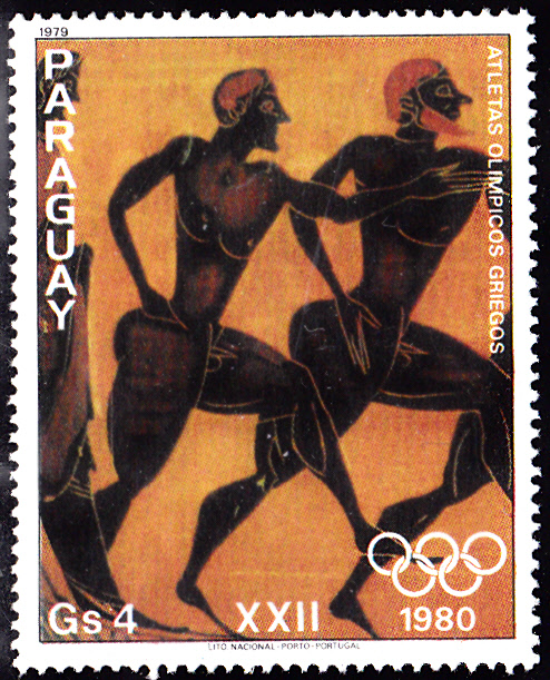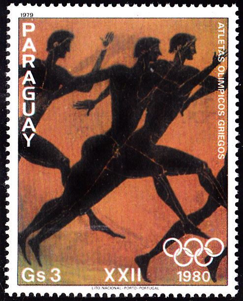 In Paraguay ist im Dezember 1979 eine Serie zu den Olympischen Spielen 1980 erschienen mit "Olympioniken" nach Gemälden auf griechischen Vasen. Hier eine Marke der Serie (MiNr 3239) mit antiken Läufer.