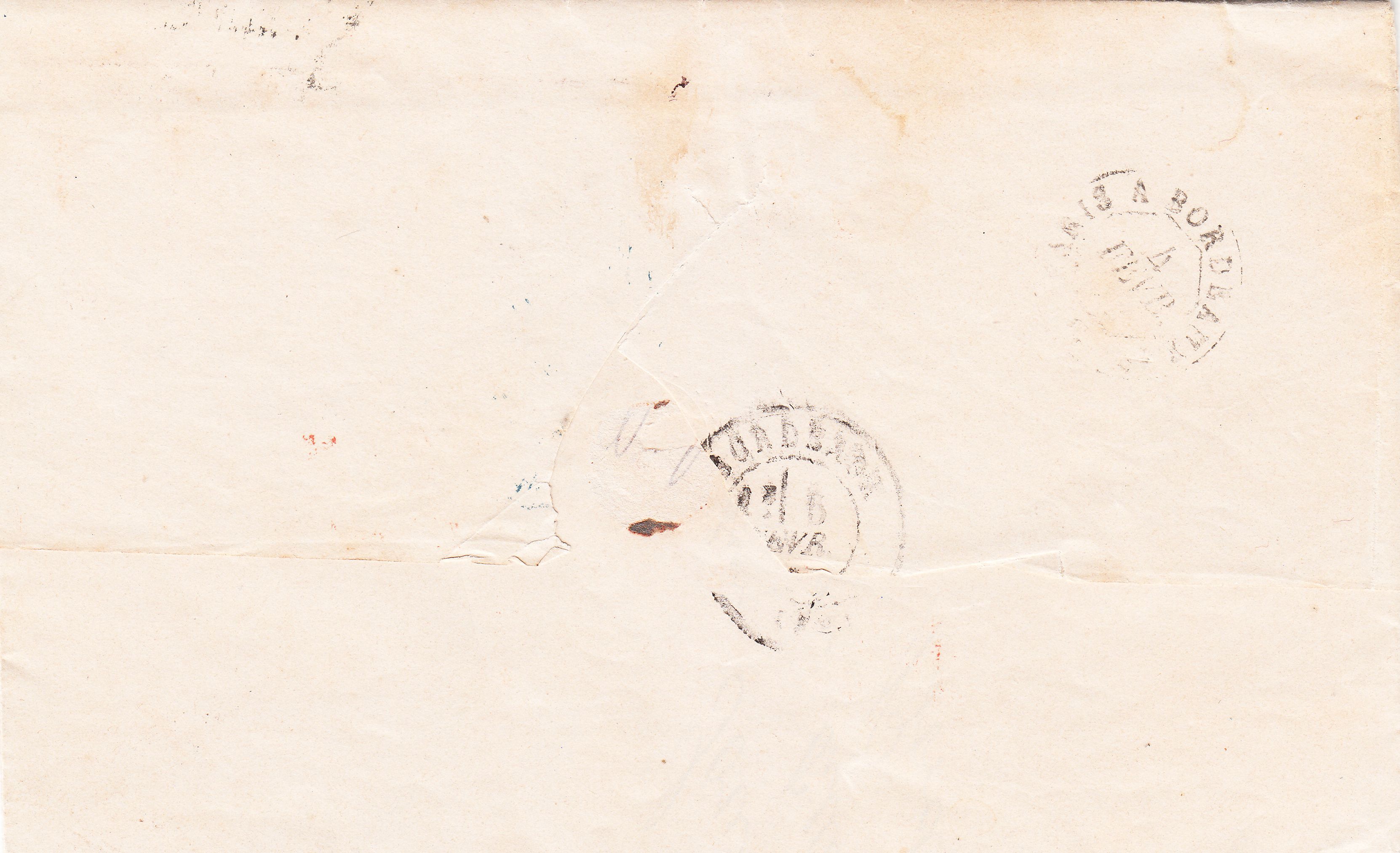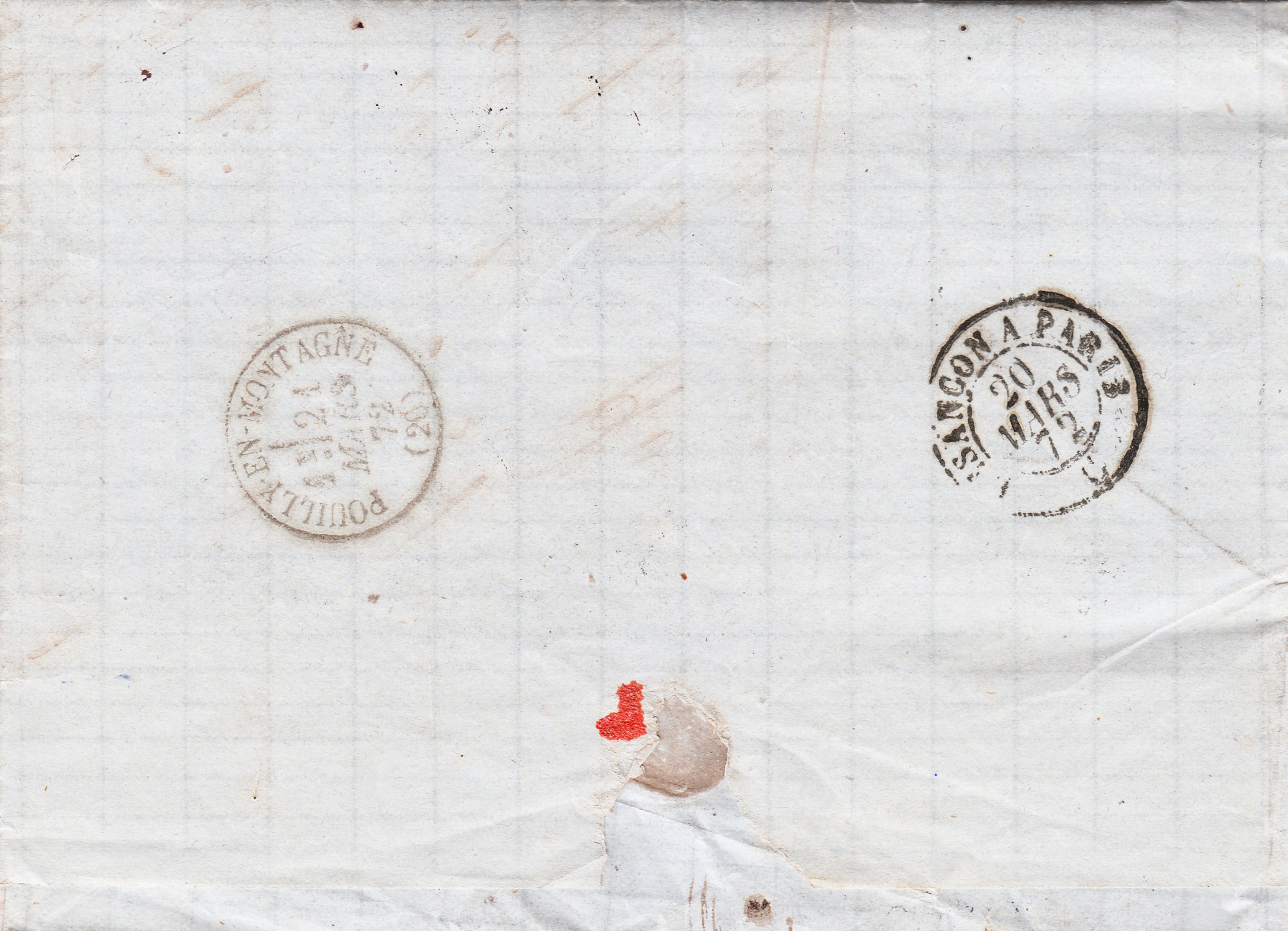Bei dem auf der Rückseite abgeschlagenen Zweikreisstempel handelt es sich um einen Bahnpoststempel, denn dieser Brief wurde von Besançon nach Paris = "BESANCON A PARIS" per Eisenbahn befördert. Die Nachbarstädte Dijon in Burgund, Lausanne in der Schweiz, Belfort am Fuß des Elsass und die Grenze zu Deutschland liegen alle in 90 Kilometer Entfernung von Besançon. Die französische Hauptstadt Paris ist 327 Kilometer (Luftlinie) entfernt.
