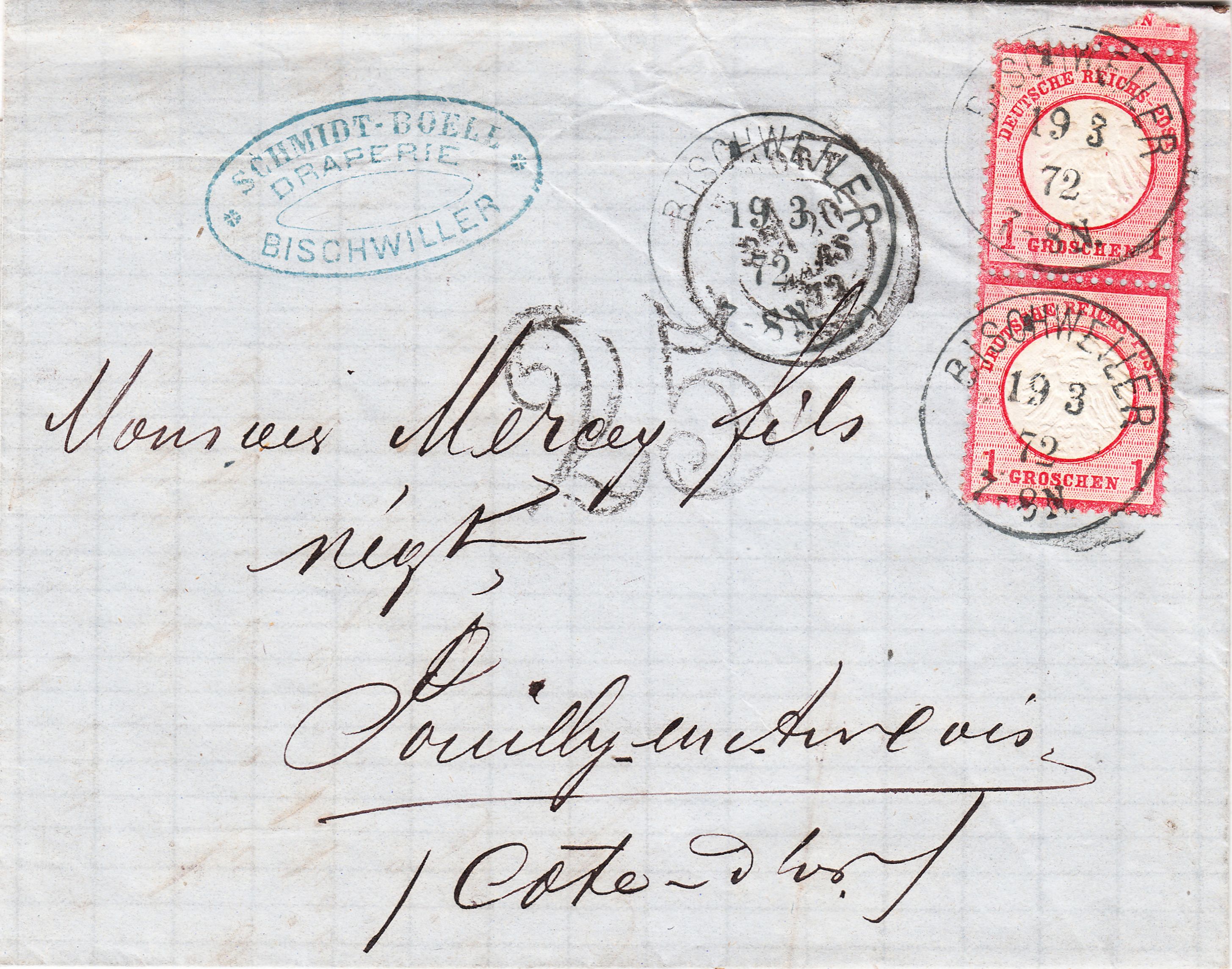 "gut erhaltener Faltbrief von Bischweiler (Elsass) 19.3.72 nach FR (Pouilly-en-Auxois Côte d'Or = Burgund)) mit Übergangsstempel "Besancon A Paris" 20. Mar.72 und Ankunft Pouilly-en Montagne 21. Mar. 72 mit Strafporto 25c hier der seltene geschwungene doppellinige Stempel. Die deutschen Brustschildmarken aus Els-Lothr wurden vom 1.1. bis Mitte Mai 1872 nicht anerkannt und mit einem Strafporto/Taxstempel belegt. Seltene Periode im dt-frz Postkrieg "