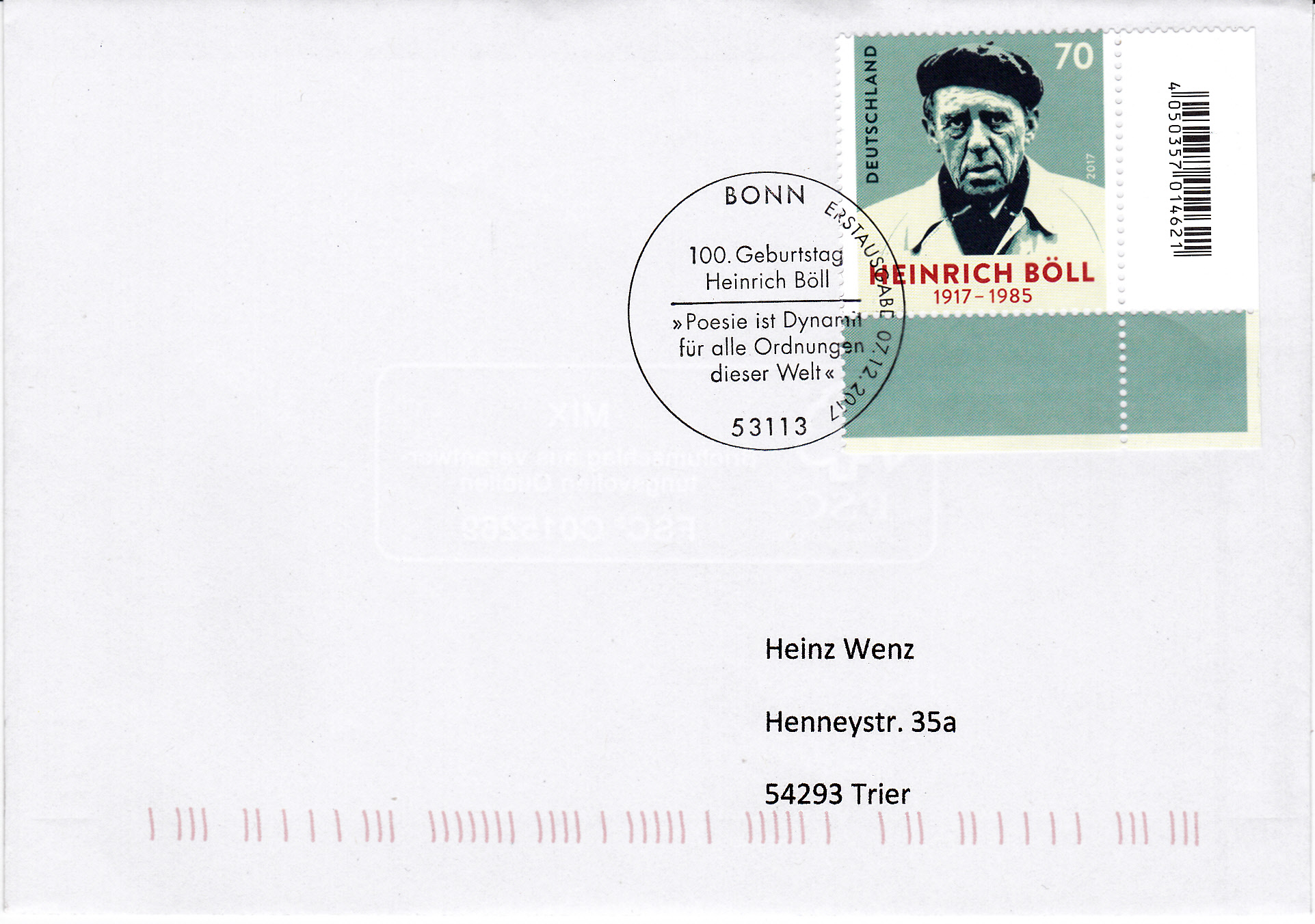 Im Ersttagsonderstempel Bonn zu dieser Marke ist ein weiteres Zitat von Heinrich Böll zu lesen.