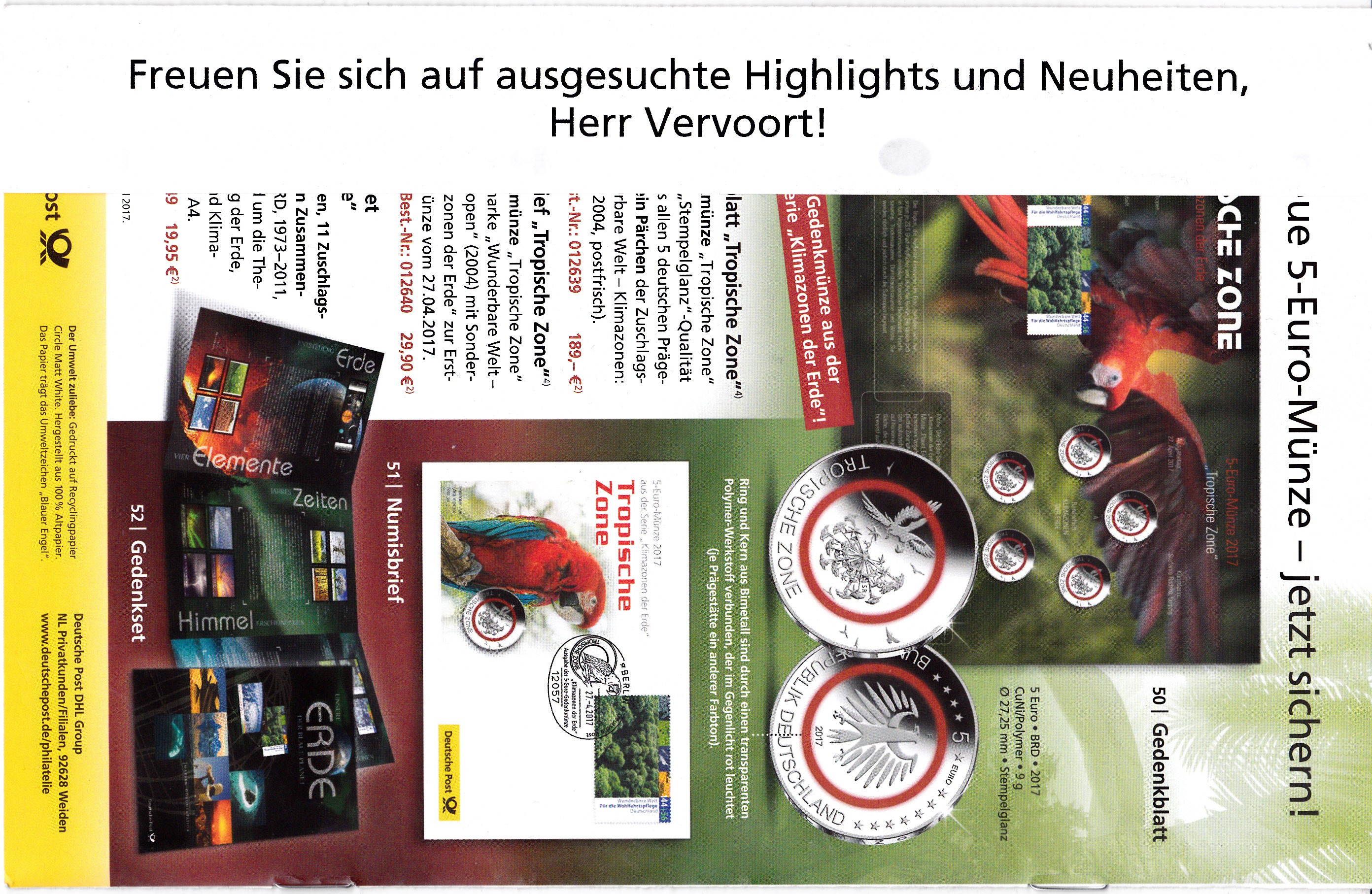 Faltbrief im Format 210 mm x 102 mm mit Wertstempel der 70C-Marke aus der Dauerserie Blumen" mit dem Motiv "Schokoladen-Kosmee" (MiNr 3189) mit aufgedruckter Zähnung und Vorausentwertung "Deutsche Post (Posthorn) WEIDEN I.D.OPF (Posthorn) Privatkunden/Filialen / a / 14.-9.17-12".