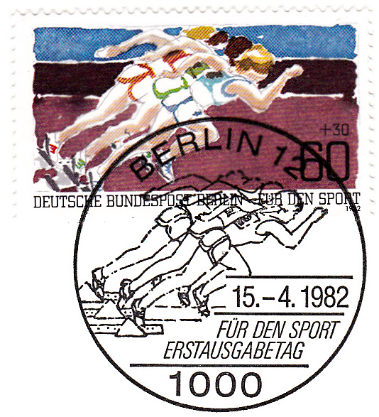 Zuschlagsmarke zu 60Pf + 30Pf "Für den Sport" der Deutschen Bundespost Berlin aus dem Jahre 1982 mit Kurzstreckenläuferinnen beim Start mit dem zum Motiv passenden Ersttagsonderstempel Berlin.