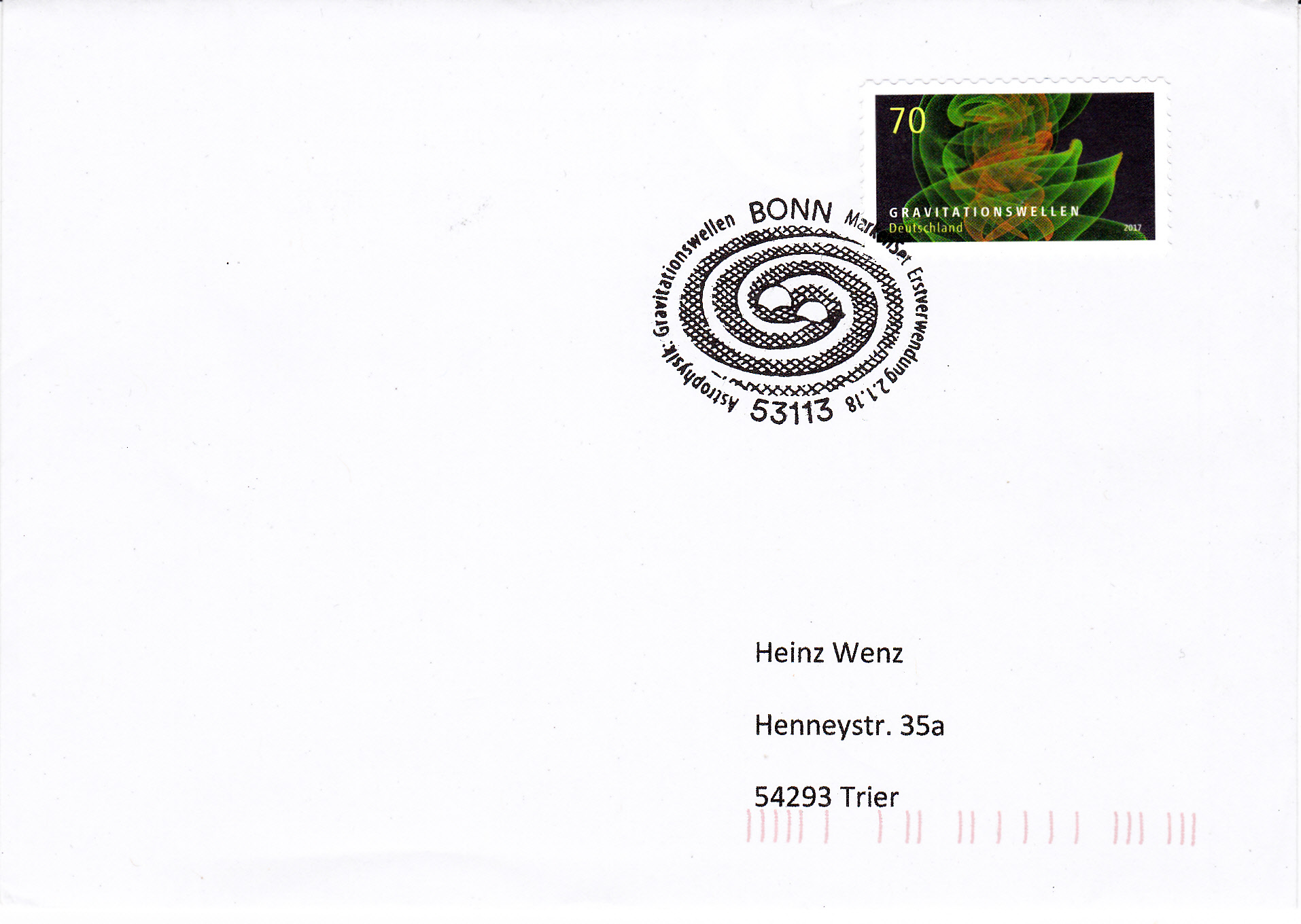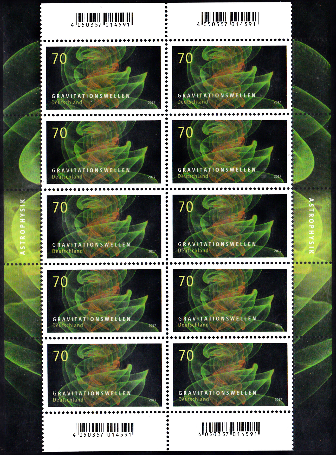 Bei der Deutschen Post erschien am 7.12.2017 eine Marke (MiNr 3348) die Gravitationswellen darstellt. Hier eine Marke vom Eckrand mit EAN-Code.