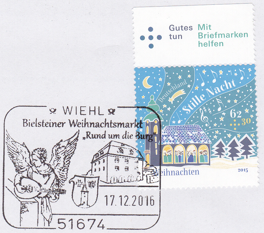 Sonderstempel vom 17.12.2016 aus Wiehl zum Bielsteiner Weihnachtsmarkt "Rund um die Burg". Im Stempelbild werden ein "Lautespielender Engel" nach Albrecht Dürer, das Altwappen Bielstein und das Burghaus Bielstein gezeigt.