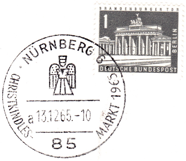 Sonderstempel aus Nürnberg vom 13.12.1965 zum Christkindlesmarkt mit dem Kennbuchstaben "a". Im Stempelbild wird wieder das Christkind gezeigt.