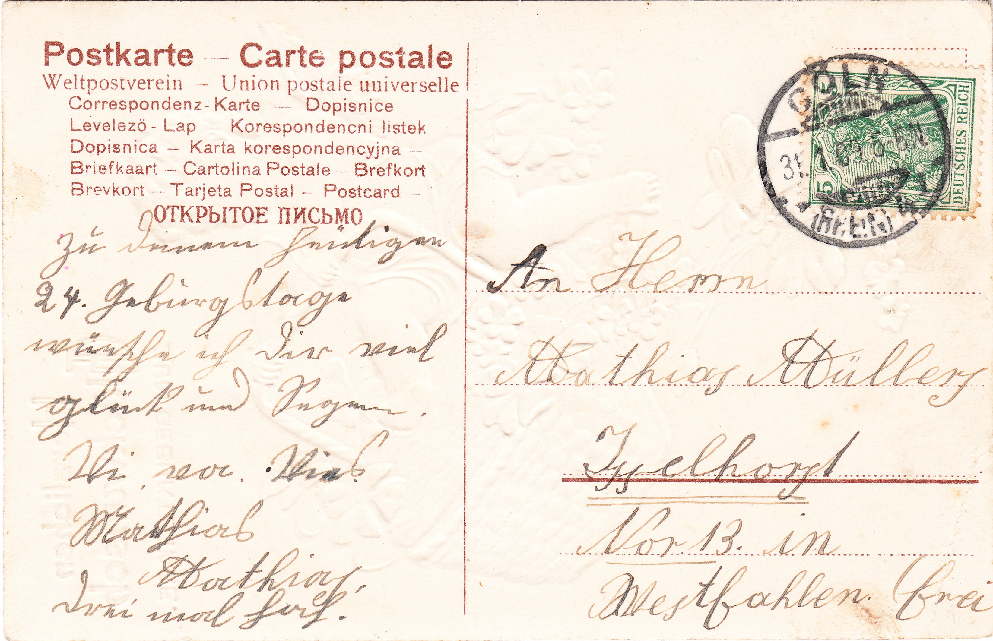 Hier als erstes Beispiel für dieses Sammelgebiet eine Geburtstagskarte mit Eindruck "Herzlichen Glückwunsch ZUM GEBURTSTAGE.":