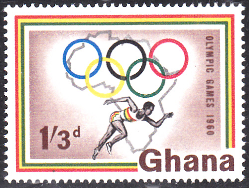 Die beiden anderen Werte aus der Serie Ghanas zeigen ebenfalls die Olympischen Ringe und einen Läufer vor der Karte von Afrika.