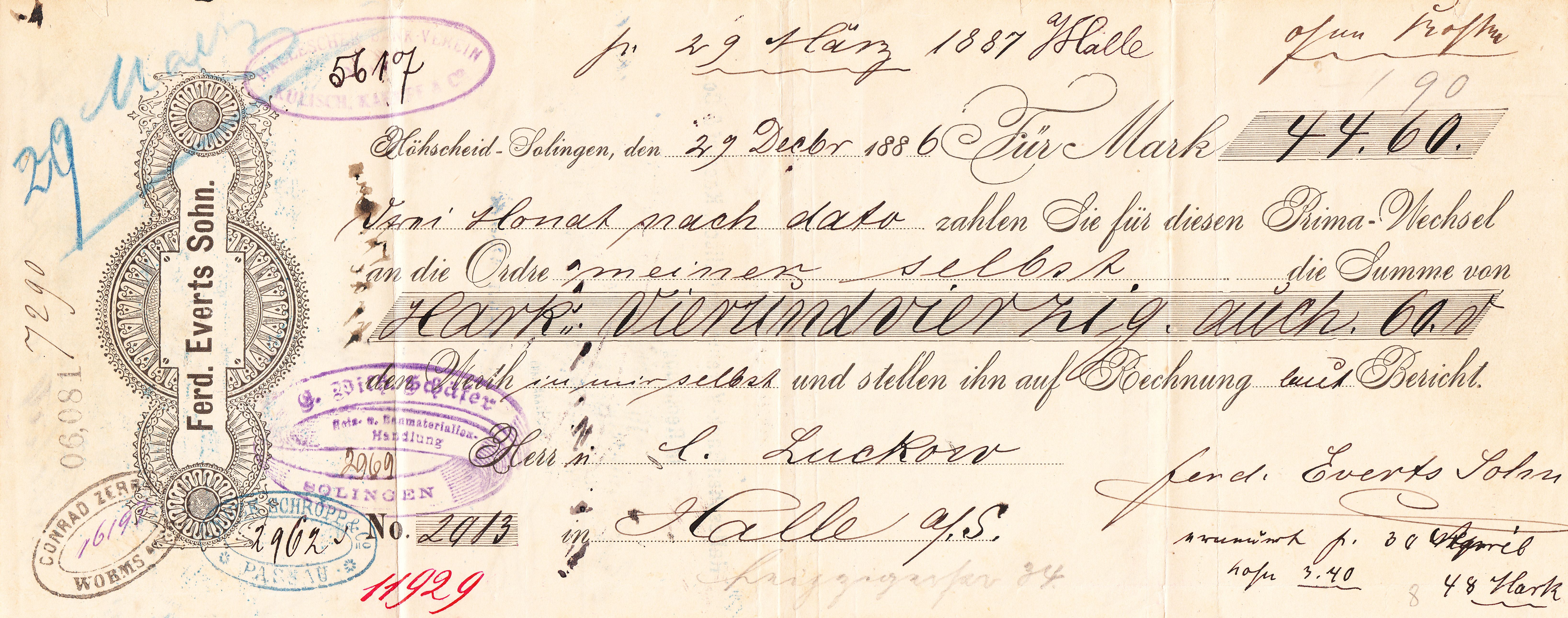 Hier eine Stempelmarke "DEUTSCHER WECHSEL-STEMPEL" mit Brustschild, gebraucht am 29.12.1886 auf einem Wechsel:
