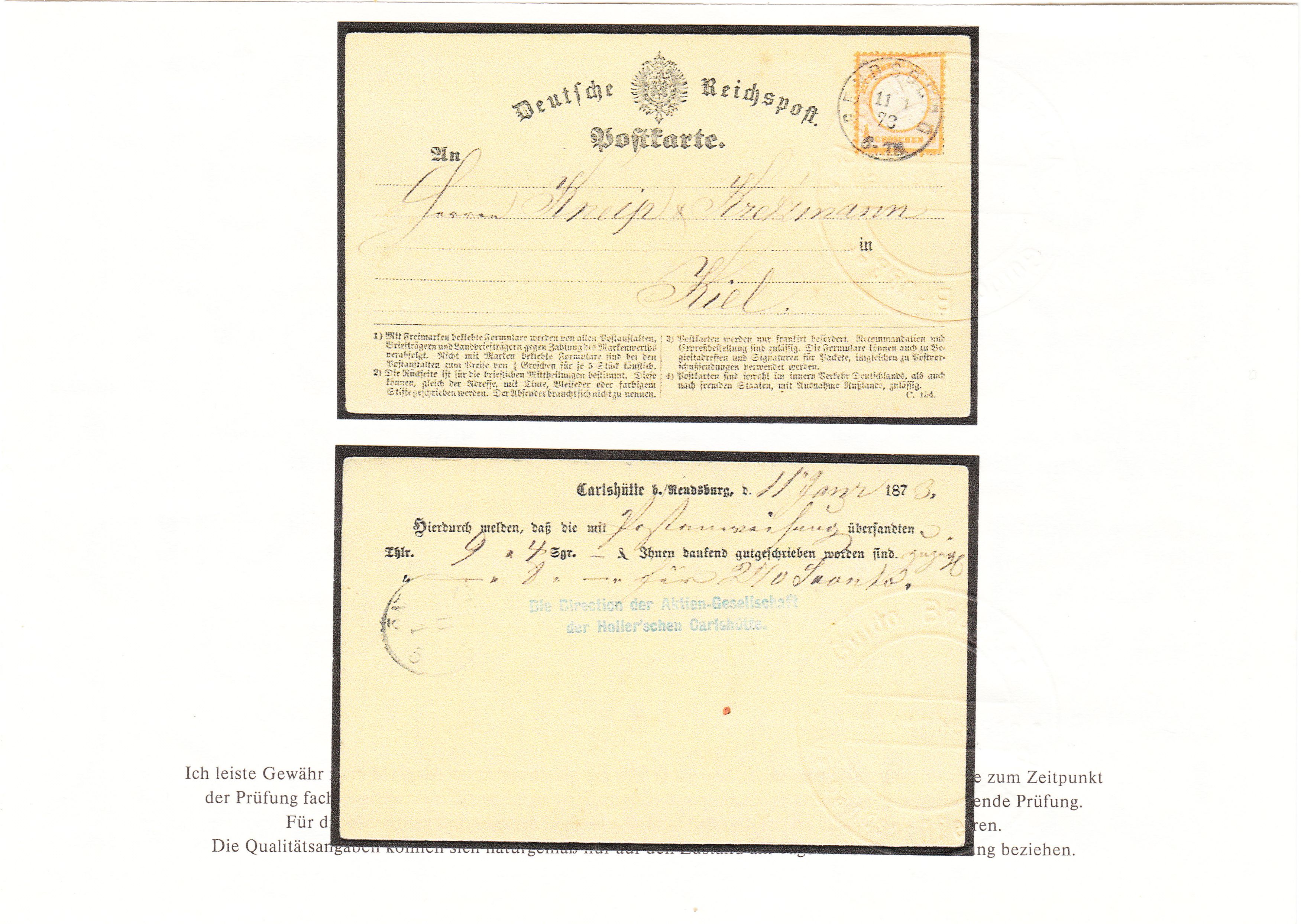Hier eine MiNr. 18 am 11.01.1873 als EF auf Postkarte von Rendsburg nach Kiel, weitere Details siehe Befund Brugger: