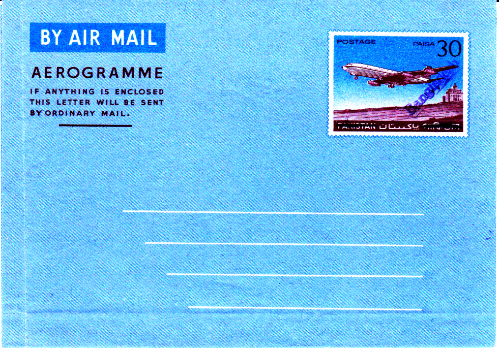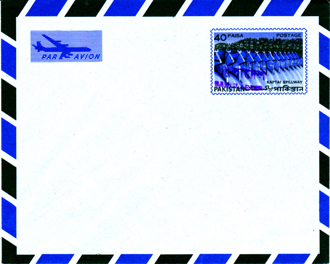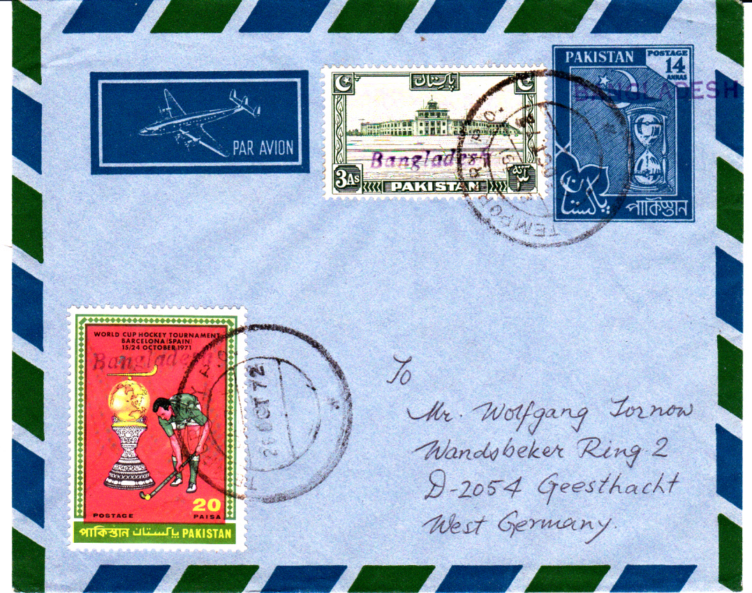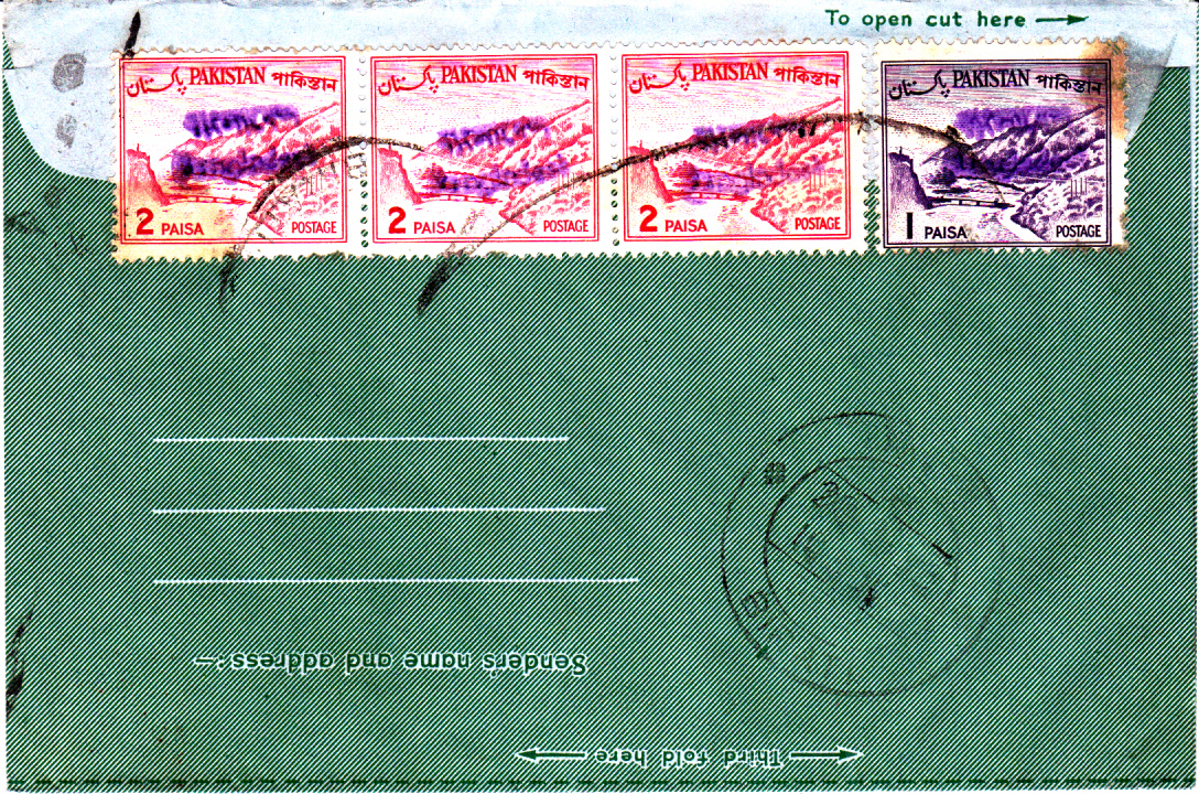 Dieser Pakistan Luftpostumschlag stammt noch aus den 50er Jahren des vorigen Jahrhunderts aus der Zeit als die Rupie noch in 16 Annas unterteilt war und 1 Anna in 12 Pies. Der Wertstempel des Umschlages wurde mit einem Handstempel vom Typ D (nur Englisch nur Großbuchstaben) überstempelt, während die beiden Marken, davon auch eine uralt Marke aus Pakistan zu 3 Annas, und die 20 Paisa Sondermarke Hockey einen Handstempel vom Typ E (Englisch nur Anfangsbuchstabe groß) aufweisen.