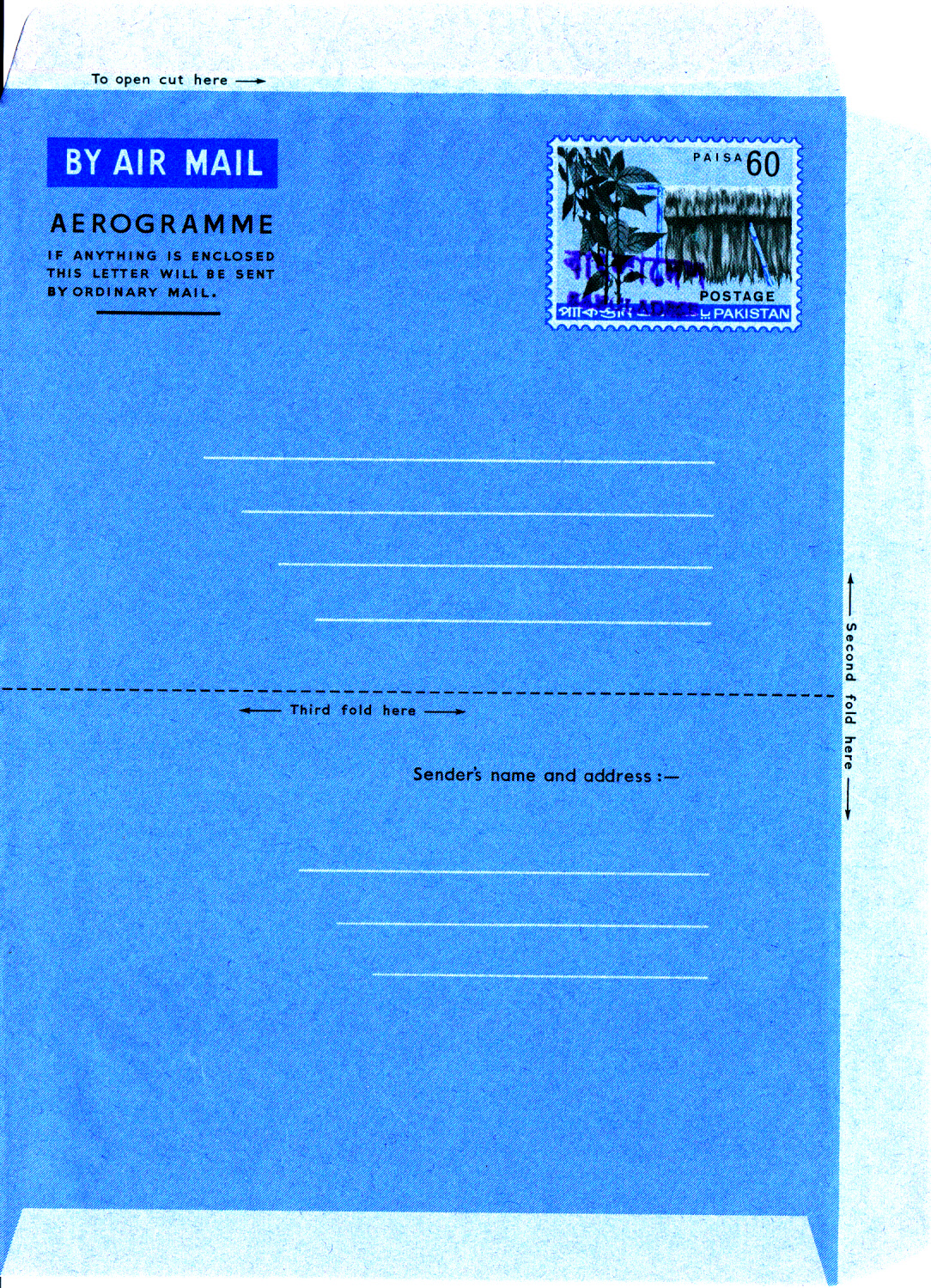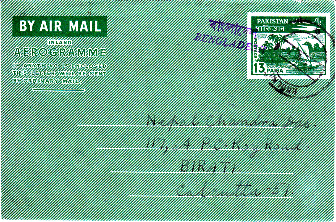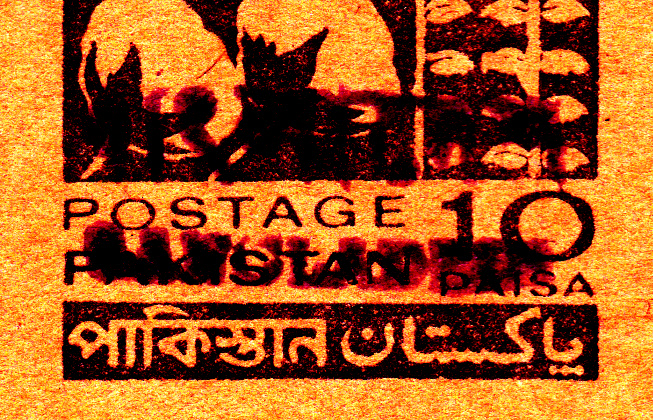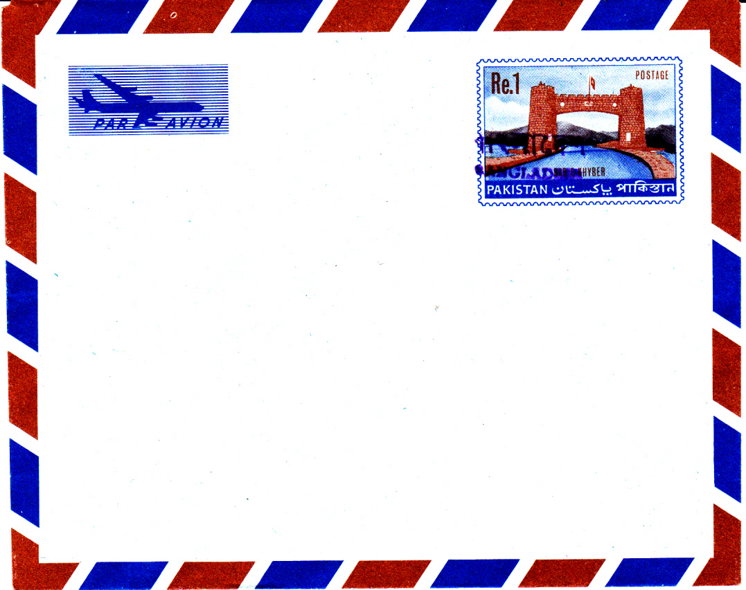 Dieser Pakistan Luftpostumschlag stammt noch aus den 50er Jahren des vorigen Jahrhunderts aus der Zeit als die Rupie noch in 16 Annas unterteilt war und 1 Anna in 12 Pies. Der Wertstempel des Umschlages wurde mit einem Handstempel vom Typ D (nur Englisch nur Großbuchstaben) überstempelt, während die beiden Marken, davon auch eine uralt Marke aus Pakistan zu 3 Annas, und die 20 Paisa Sondermarke Hockey einen Handstempel vom Typ E (Englisch nur Anfangsbuchstabe groß) aufweisen.