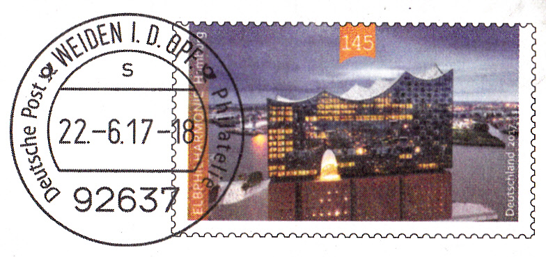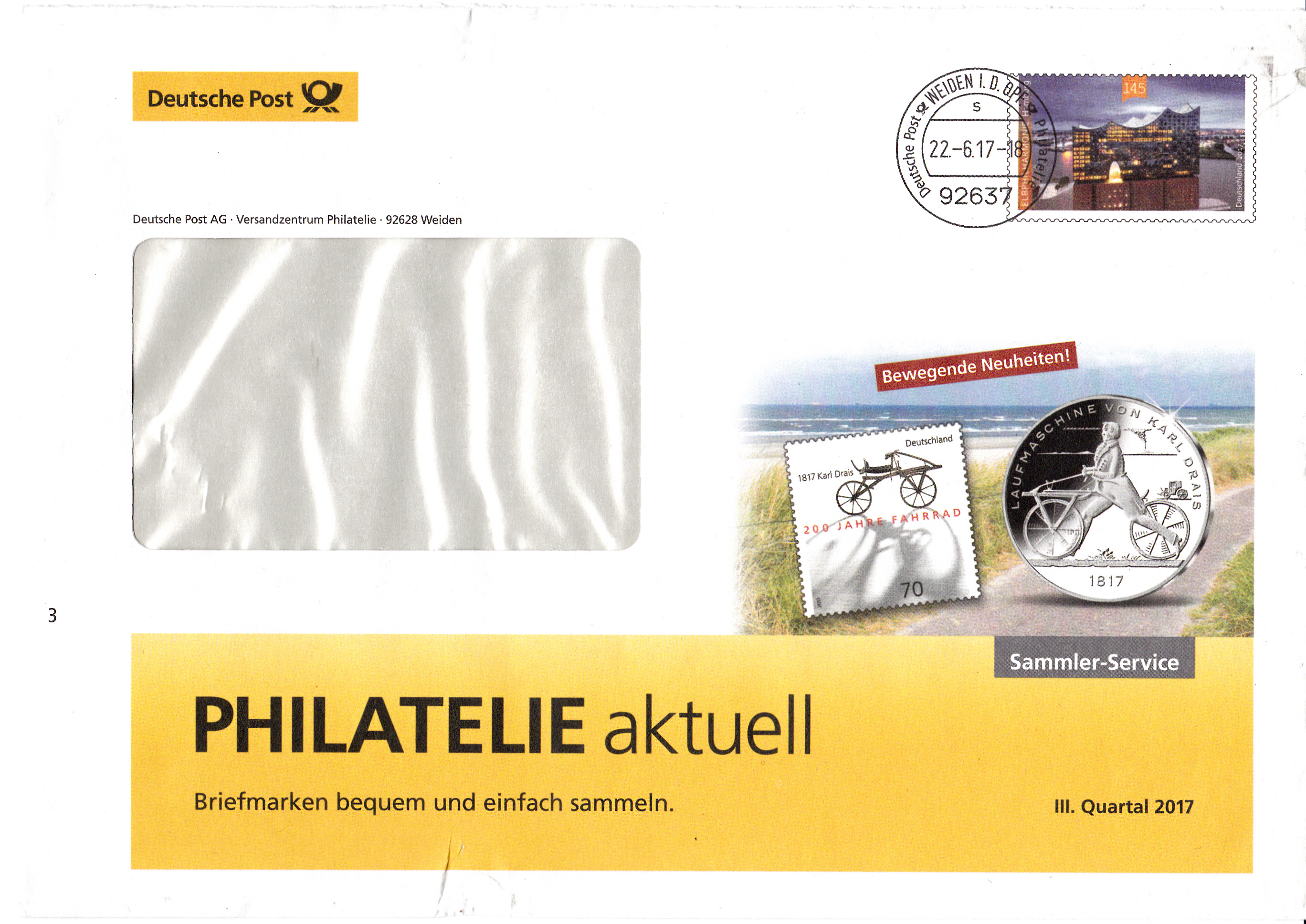 Diese Broschüre im Format 235 x 152 mm (unten geheftet) hat einen Wertstempel mit der 145 Cent Marke "Glasgefäße von Theo Baumann" (MiNr 3271) aus der Serie "Design aus Deutschland". Die Vorausentwertung hat das Datum "-7.-9.17". Obwohl dieser Umschlag vom Versandzentrum Philatelie stammt, trägt er nur das Postlogo - ohne den Zusatz Philatelie, wie sonst meist üblich.