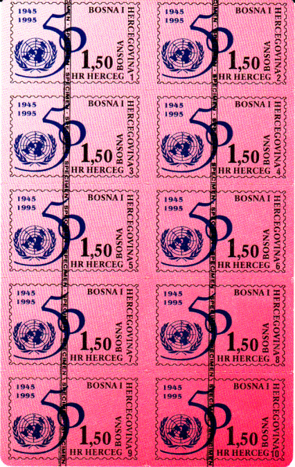 Hier zeige ich eine am 24.10.1995 in Bosnien-Herzegowina (Kroatische Post Mostar) erschienene Stampcard. Diese Konfektionierungsform wurde von einer schwedischen Firma mit dem Namen "PostLine (International) AB" entwickelt und verschiedenen Postverwaltungen unter dem Namen "STAMPCARD TM" angeboten. Die Stampcards haben die Größe der damals häufig benutzten Telefonkarten und konnten somit auch über die gleichen Automaten verkauft werden. Die Stampcard enthält 10 selbstklebende Marken (MiNr 21). Die Marken sind von 1 bis 10 nummeriert und die Farbe rot wird von links oben nach rechts unten immer intesiver. Es sind daher eigentlich zehn verschiedene Marken mit nur einer MiNr. Der amtliche Charakter dieser Ausgabe ist lt. Michel-Katalog umstritten. Beim hier gezeigten Exemplar handelt es sich um eine Musterkarte, erkennbar am Aufdruck "Specimen" in den beiden senkrechten Streifen.