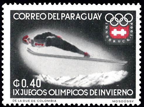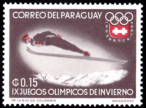 Aus der Serie aus Paraguay hat Rüdiger bereits eine Marke mit einem Skispringer hier gezeigt. Es gab insgesamt fünf bildgleiche Marken mit dem Skispringer, die hier einmal alle fünf zeige: