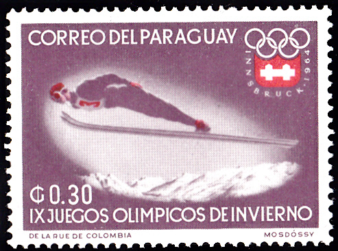 Aus der Serie aus Paraguay hat Rüdiger bereits eine Marke mit einem Skispringer hier gezeigt. Es gab insgesamt fünf bildgleiche Marken mit dem Skispringer, die hier einmal alle fünf zeige:
