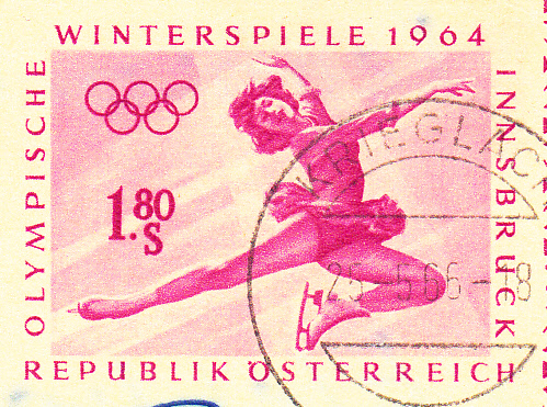 Auslands-Bildpostkarte aus Österreich mit einem Wertstempel im Muster der Marke zu 1,80 Schilling (MiNr 1139) zu den Olympischen Winterspielen 1964. Die Postkarte wurde am 25.5.1966 nach Frankfurt verschickt.