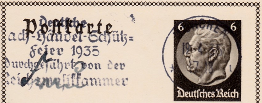 Maschinenwerbestempel aus München mit dem Werbeeinsatz "Deutsche Bach-Händel-Schütz-Feier 1935 durchgeführt von der Reichsmusikkammer" auf einer Bildpostkarte von 1935 (MiNr P 236 Serie 56 Bild 7).