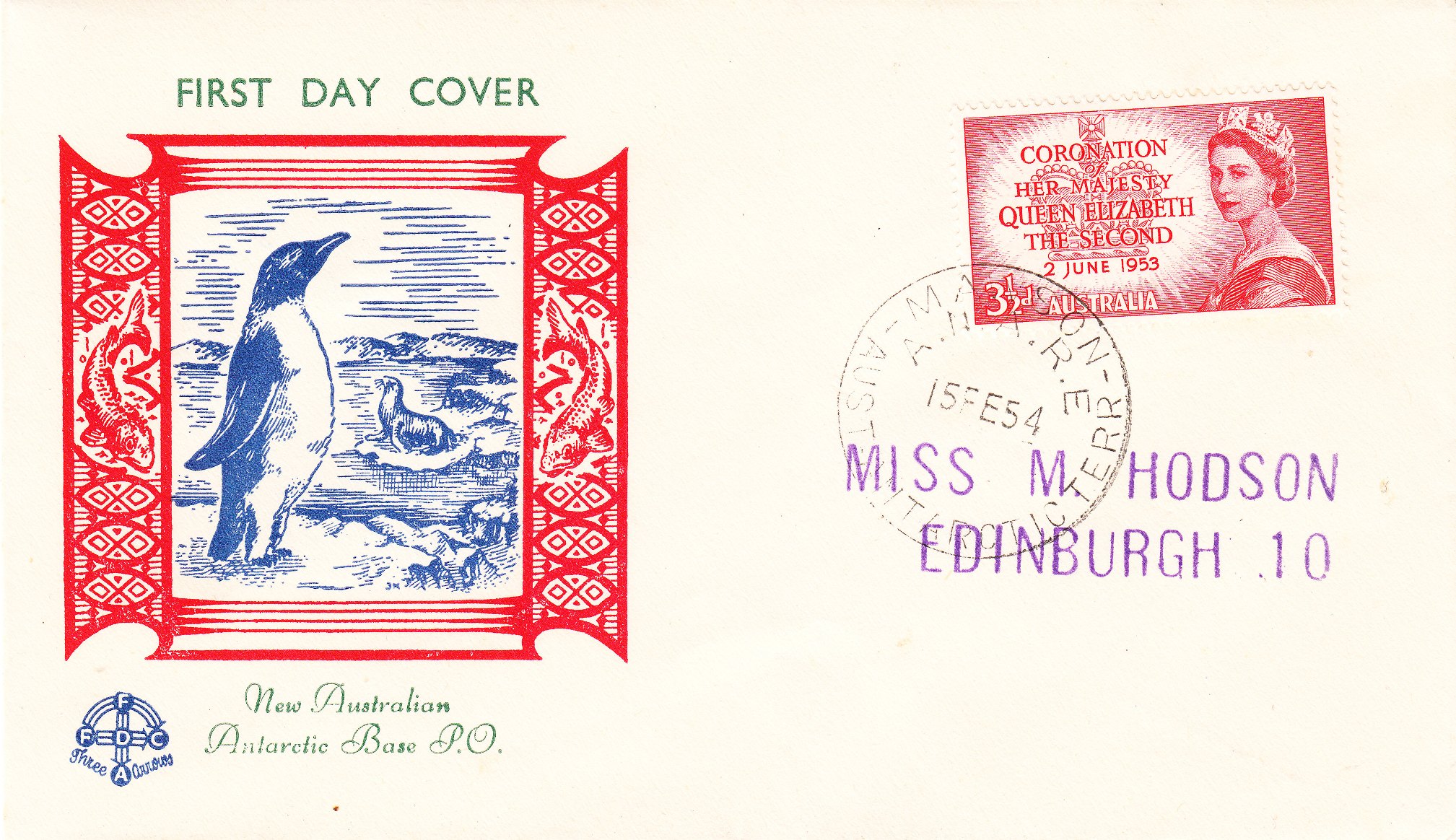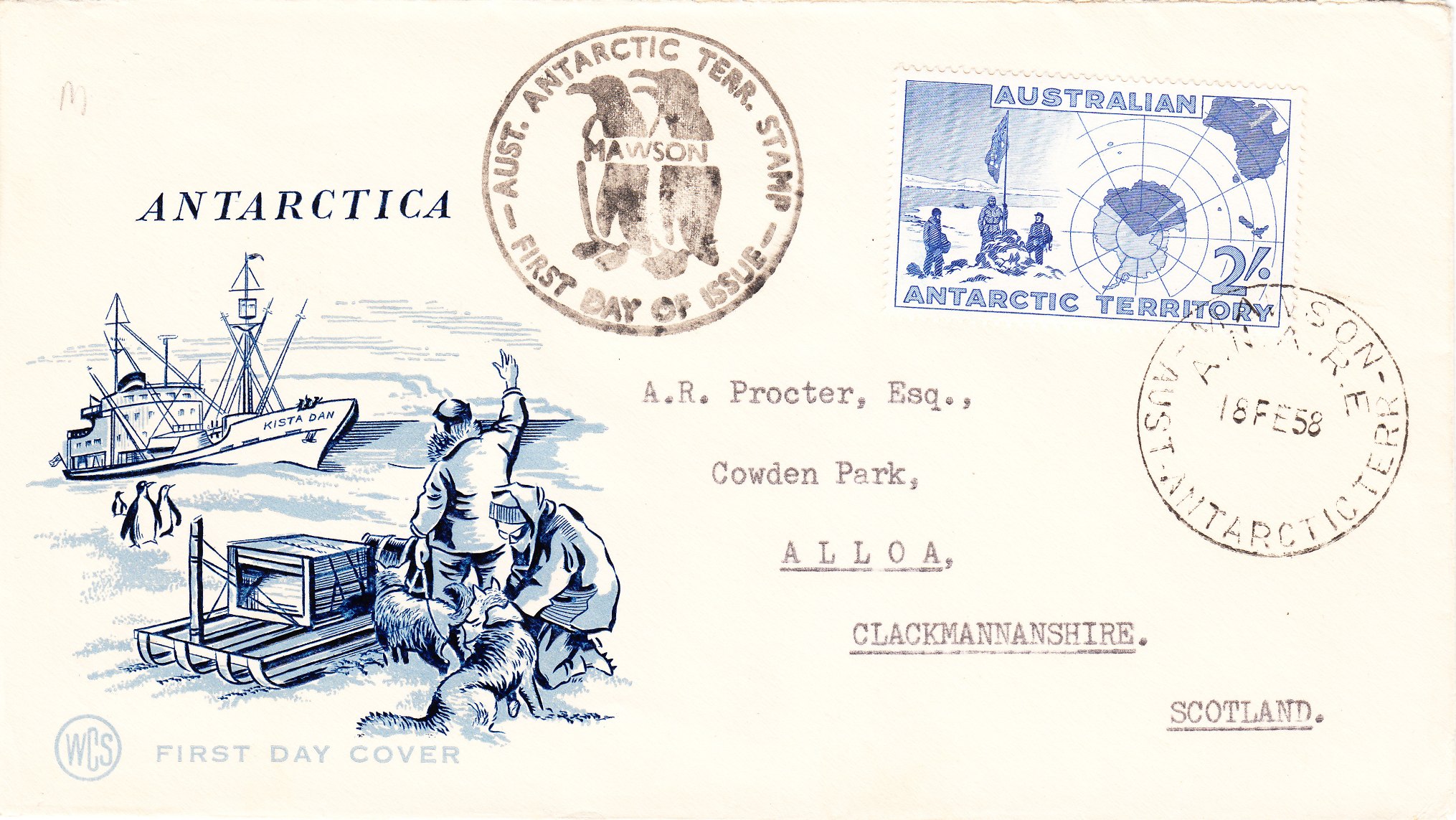 Dieser Beleg mit australischer Frankatur wurde am 05.03.1956 gestempelt "MAWSON - AUST. ANTARCTIC TERR - A.N.A.R.E":
