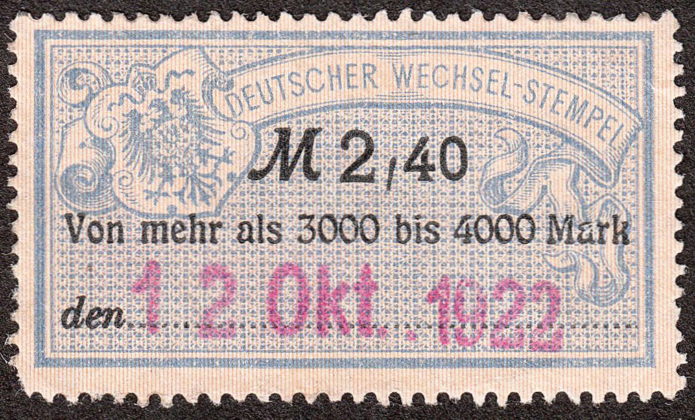 Diese Marke der Wertstufe "M 2,40" entsprach am 12.10.1922 der Gebührenstufe für eine Summe "Von mehr als 3000 bis 4000 Mark":