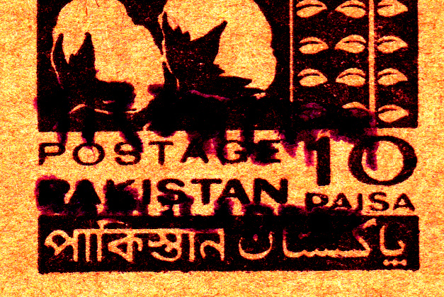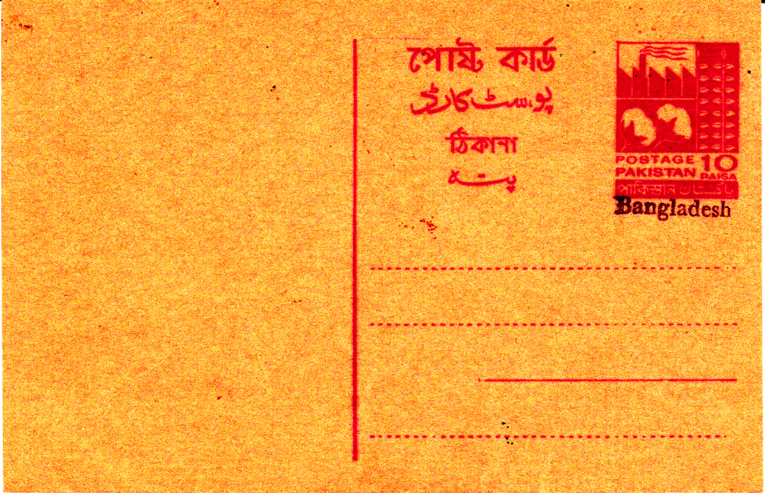 Jetzt einen aus Pakistan zu einer Rupie mit einem Handstempel vom Typ A (Bangladesh in Bengali und in Englisch nur Großbuchstaben).