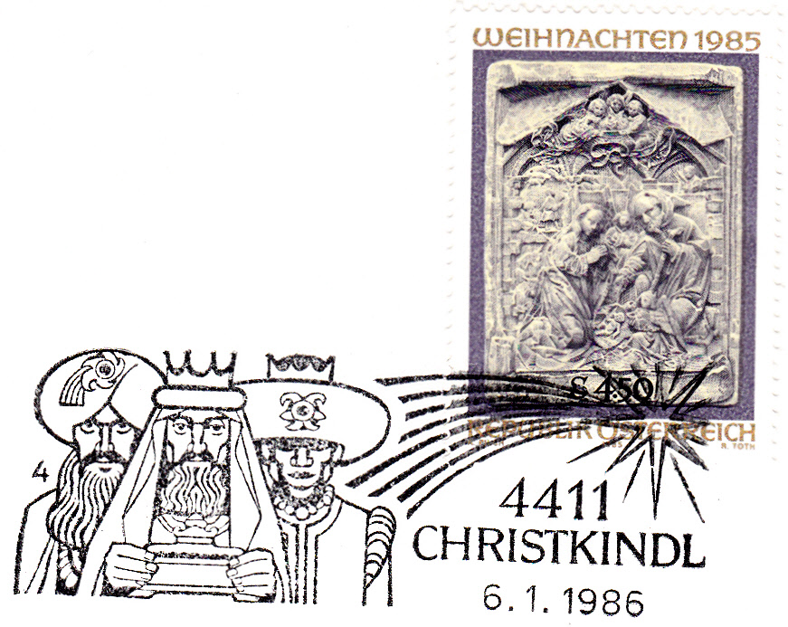 Der Sonderstempel aus Christkindl mit einem Motiv "Heilige Drei Könige" wird immer in der Zeit von 27.12. eines Jahres bis zum 6.1. des Folgejahres verwendet. Hier ein Stempel vom letzten Verwendungstag (6.1.1986) mit der Kennziffer "4".