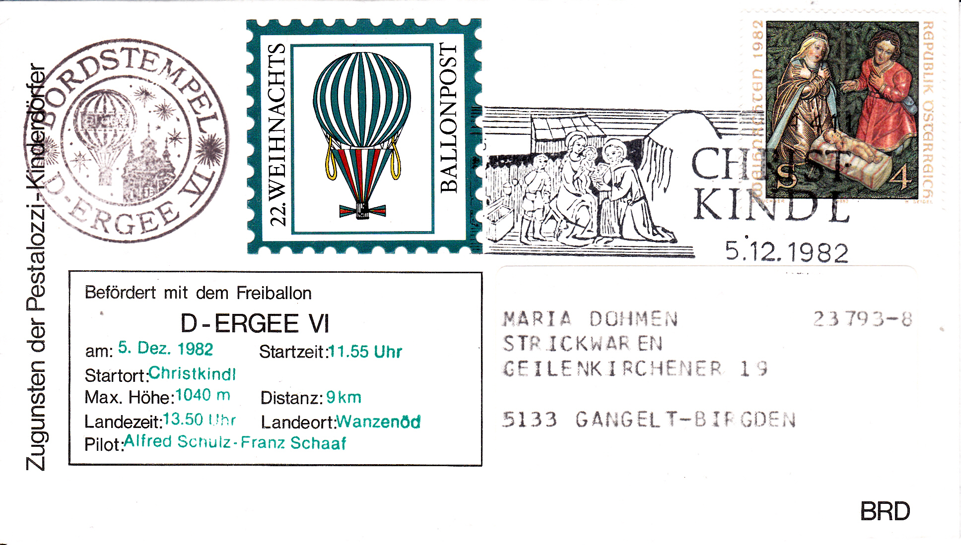 Dieser Briefumschlag der 22.Weihnachtsballonpost wurde mit dem Stempel mit der Kennziffer "5" gestempelt: