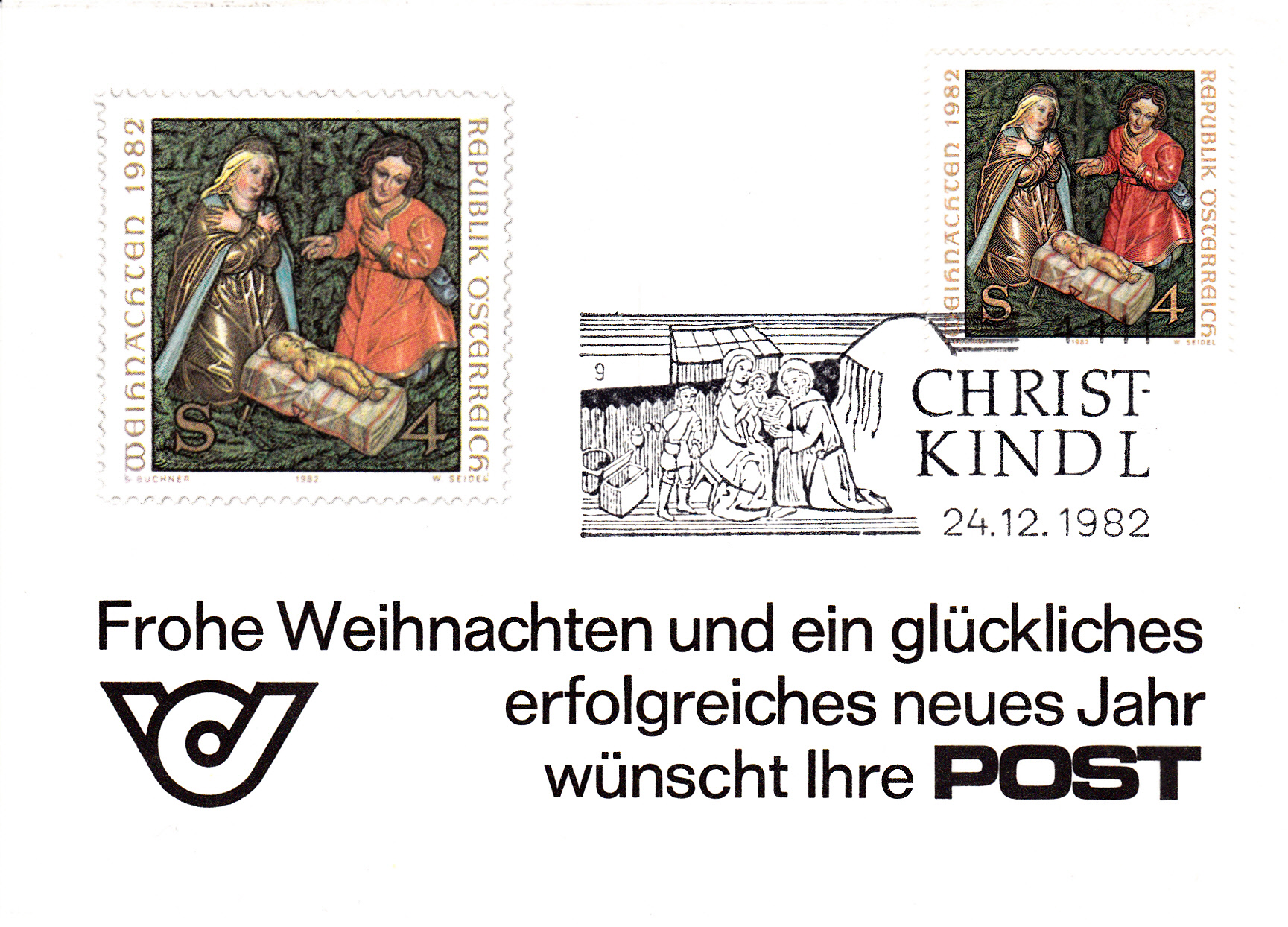 Dieser Sonderstempel des PA Christkindl vom 24.12.1982 hat die Kennziffer "9". Er wurde auf einer Glückwunschkarte der österreichischen Post angebracht.
