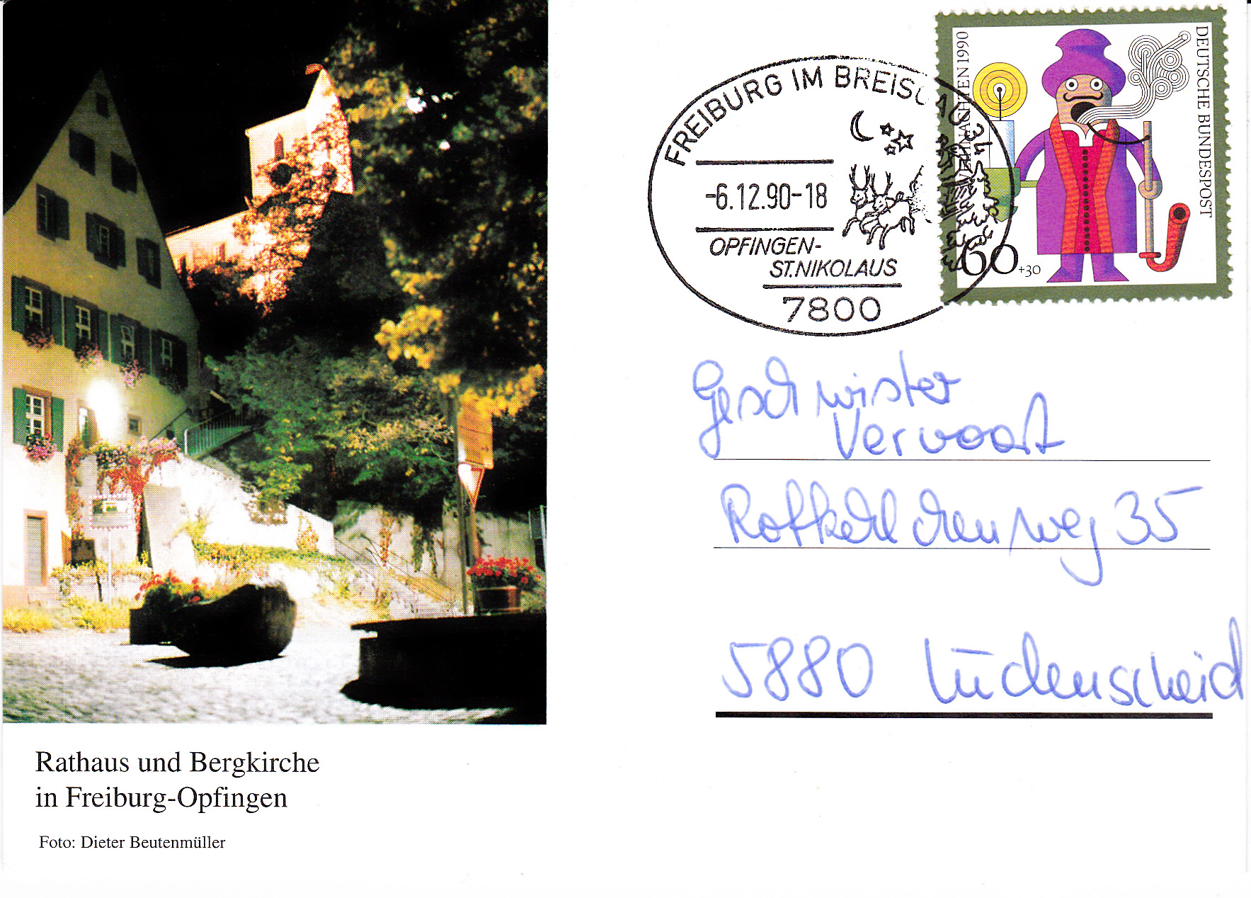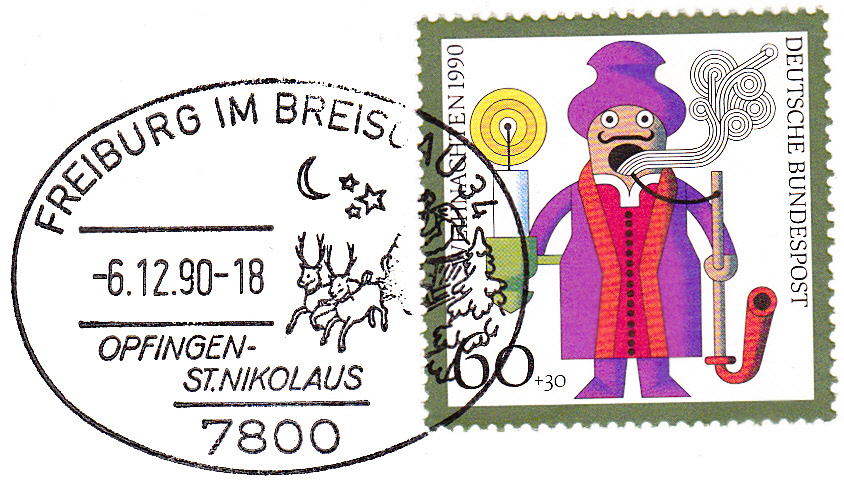 Sonderstempel vom 6.12.1990 aus Freiburg zum Nikolaustag in Opfingen St. Nikolaus. Im Stempel ein Weihnachtsmann mit Rentierschlitten.