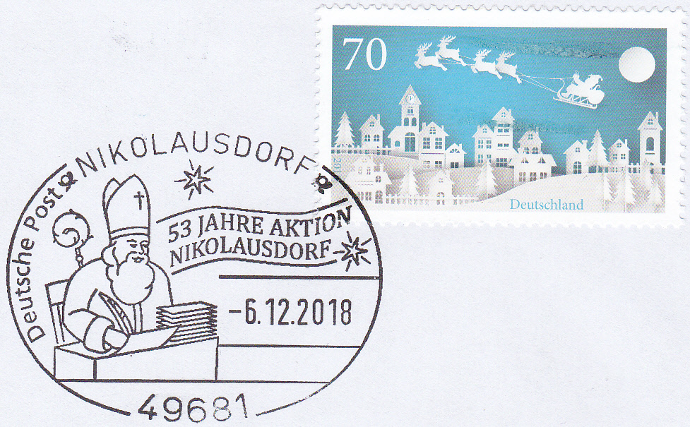 Sonderstempel aus Nikolausdorf vom 6.12.2018 mit St. Nikolaus beim Briefeschreiben.