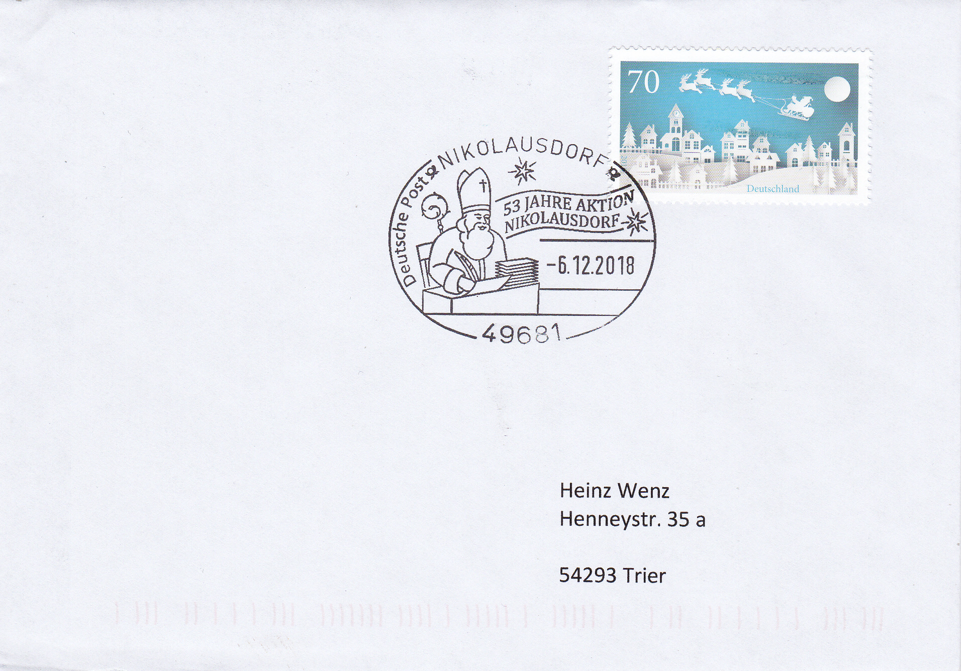 Am 6.12.2020 wurde die Weihnachtsmarke 2020 der DPhJ auf diesem Brief mit dem Sonderstempel aus 16798 Himmelpfort gestempelt.
