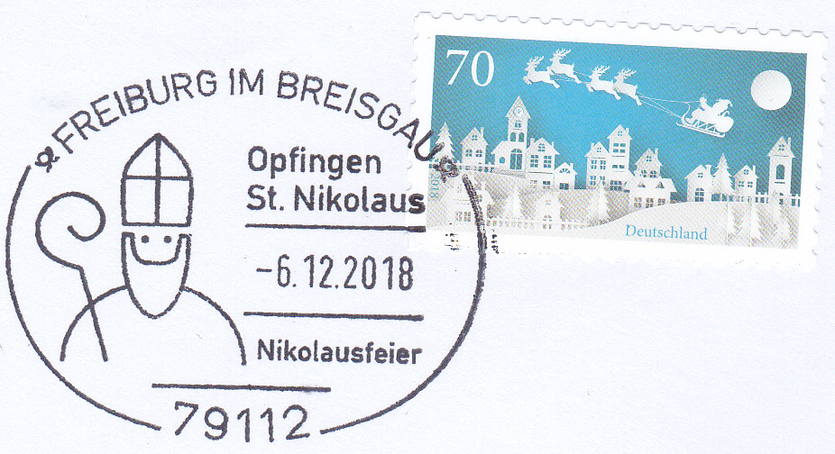 Sonderstempel aus Freiburg vom Nikolaustag 2017 zur Nikolausfeier in Opfingen. Im Stempelbild wird ein stolosierter Nikolaus gezeigt.