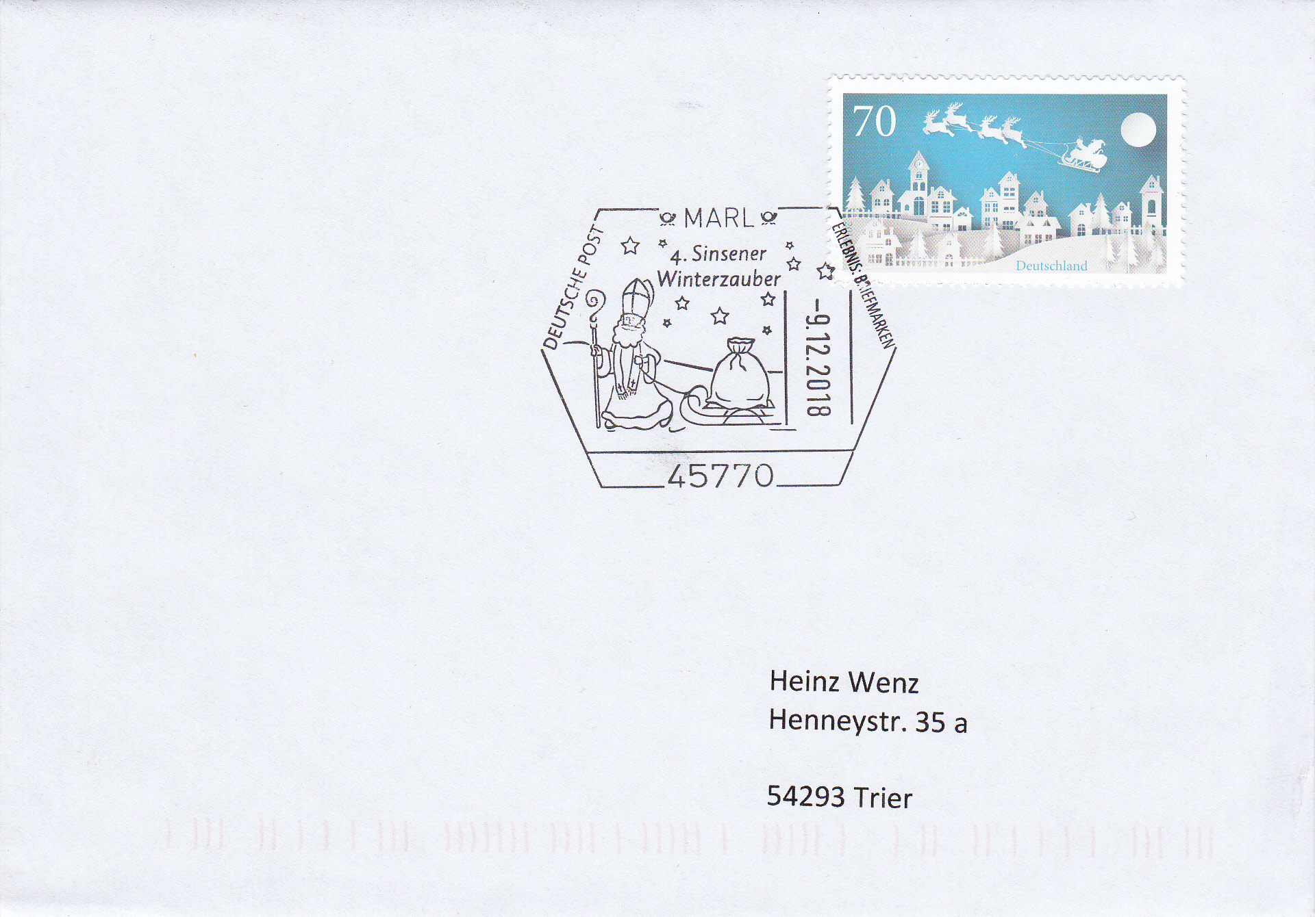 Auf auf diesem Sonderstempel aus Marl vom 9.12.2018 wird ein Nikolaus mit Schlitten gezeigt.