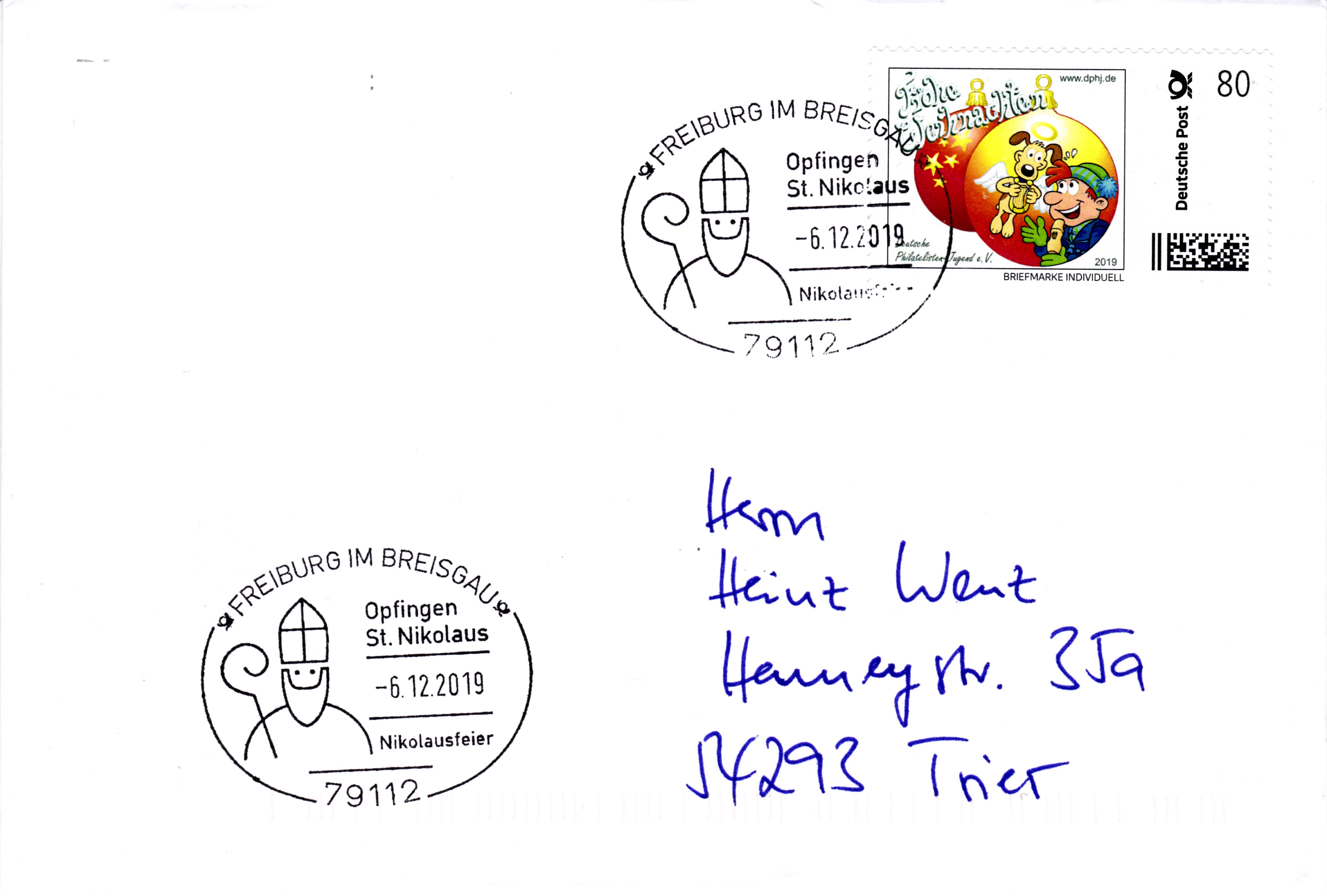 Der Sonderstempel aus Freiburg am Nikolaustag zur Nikolausfeier in Opfingen mit dem Stempelbild "stilisierter Nikolaus" wird offensichtlich alljährlich "wiederverwendet", wie dieser Stempelabschlag vom 6.12.2019 belegt. Ein neues Stempelmotiv wäre sicherlich mal wieder interessanter.