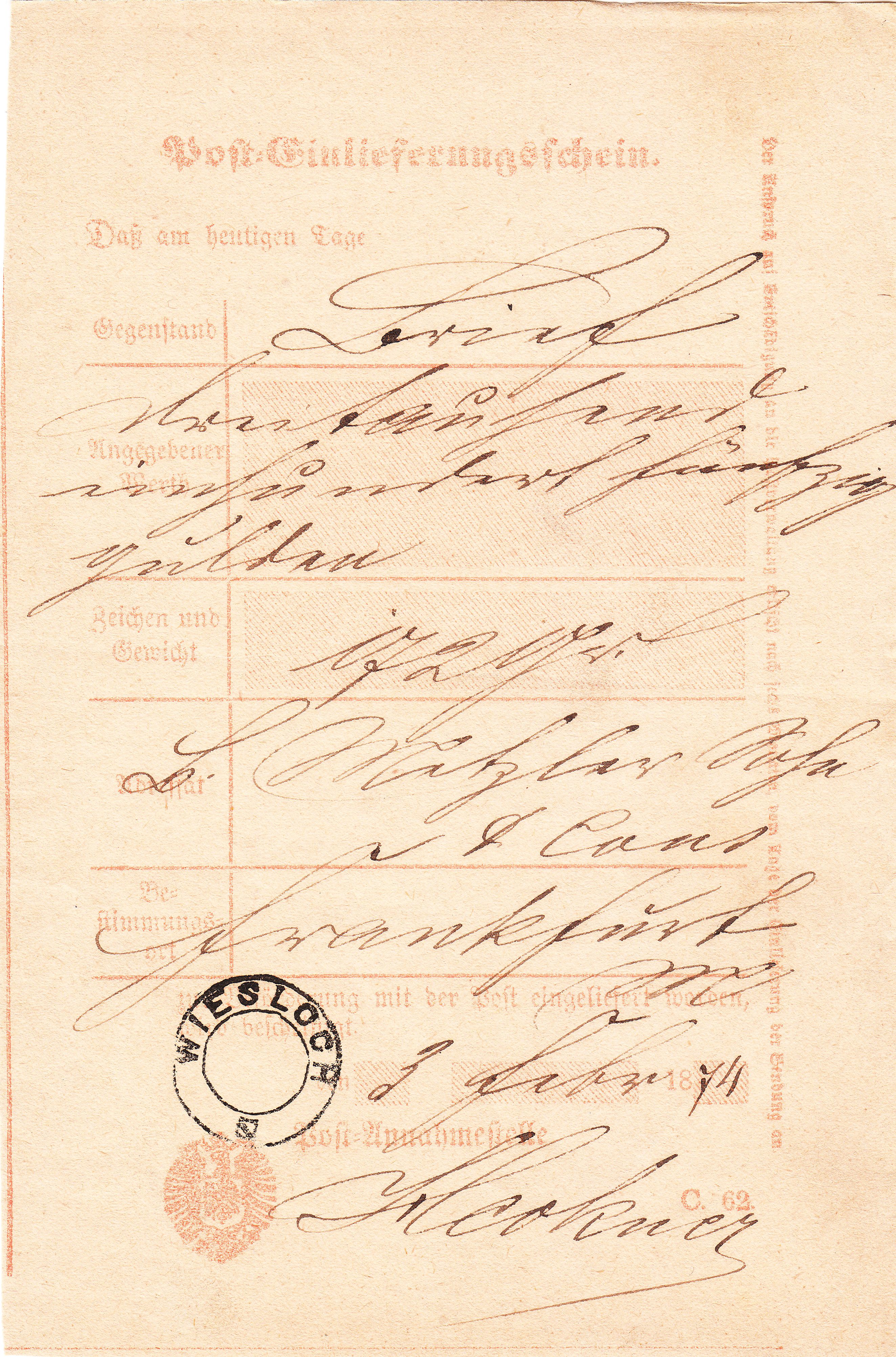 Hier aus derselben Quelle stammend ein weiterer Post-Einlieferungsschein mit dem aptierten Zweikreisstempel "WIESLOCH" mit badischem Wappen unten: