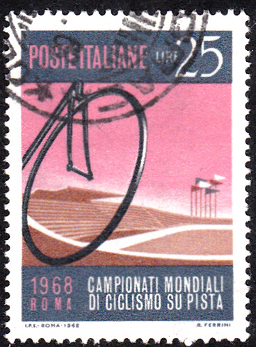 Zur Radweltmeisterschaft 1968 in Rom erschien in Italien diese Marke, MiNr. 1278, für die Radrennen auf der Bahn mit der Abbildung des Vorderrads eines Bahnrennrades.