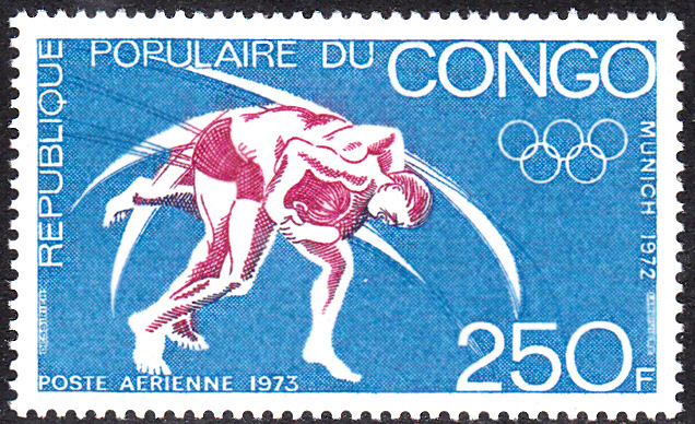 In der Volksrepublik Kongo (Kongo-Brazzaville, heute Republik Kongo) erschien neben den bereits gezeigten beiden Marken aus dem Jahre 1971 erst 1973 (!) eine weitere Serie. Hier die erste Marke dieser Serie (MiNr 357) mit einem Hürdenläufer.