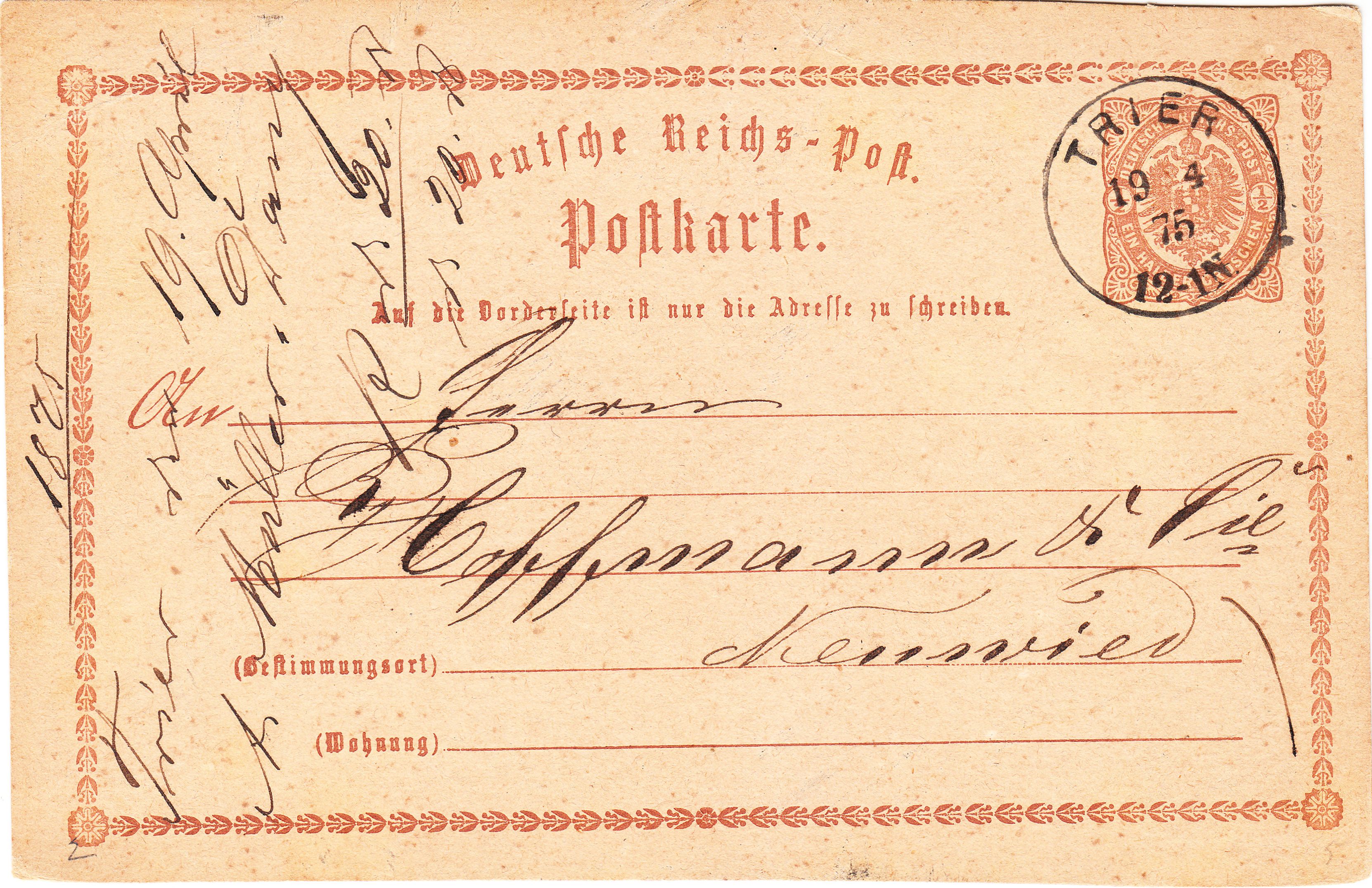 Heute eine Ganzsache MiNr. P 1, entwertet per Kreisstempel TRIER am 19.04.1875, also zur Zeit der Markwährung: