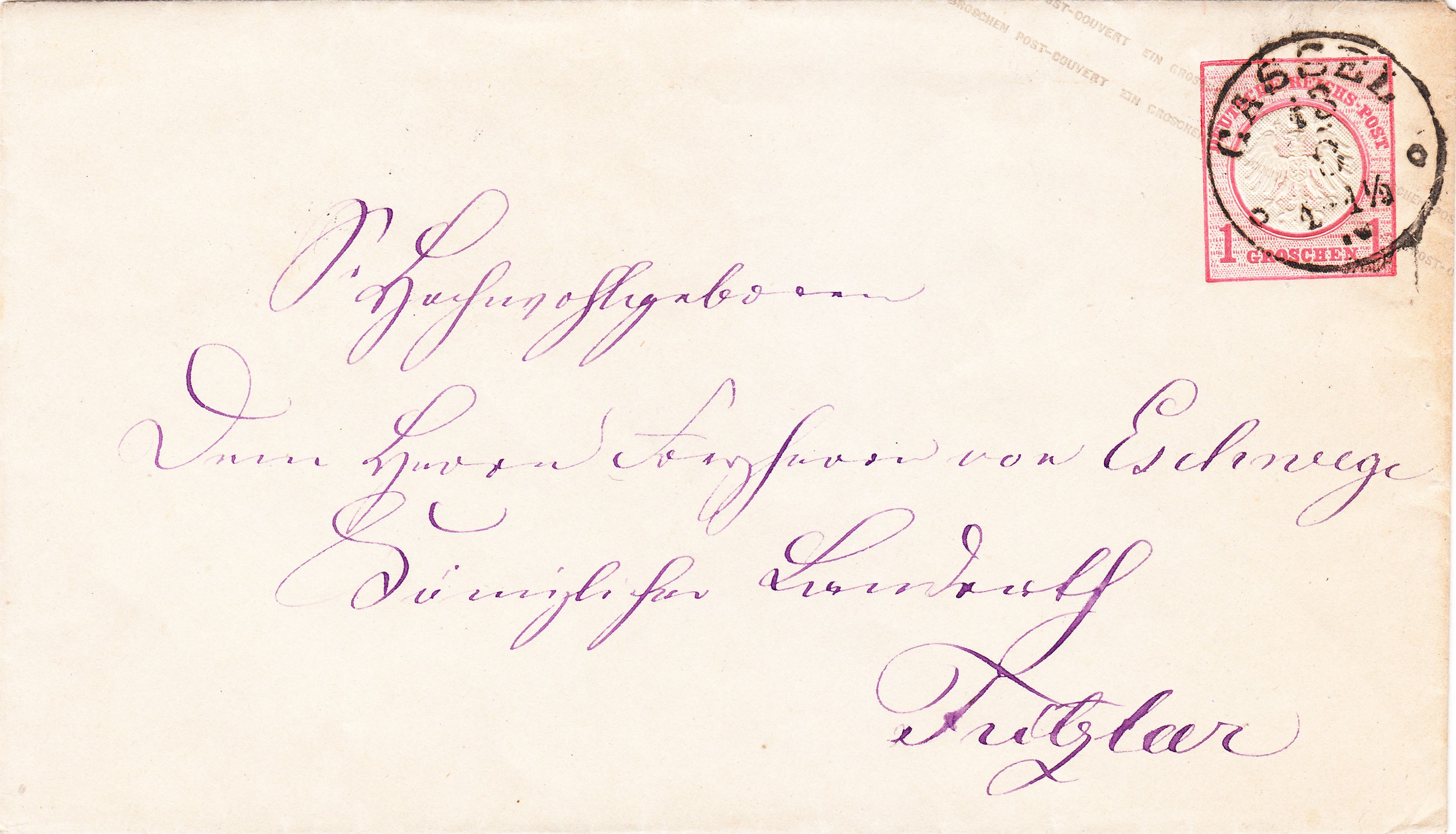 Heute habe ich als nächste Neuerwerbung vom Tauschtag in Leverkusen diese Ganzsache U 1 II A mit nachverwendetem Thurn & Taxis - Kreisstempel CASSEL "mit Kringel" für Euch, katalogisiert als Feuser TT 074B: