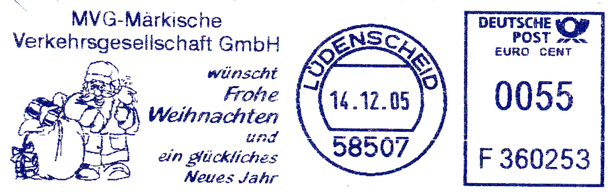 Dieser Freistempel der Märkischen Verkehrsgesellschaft GmbH vom 14.12.2005 wird neben den Weihnachts- und Neujahrswünschen auch noch ein Weihnachtsmann mit einem großen Geschenkesack gezeigt.