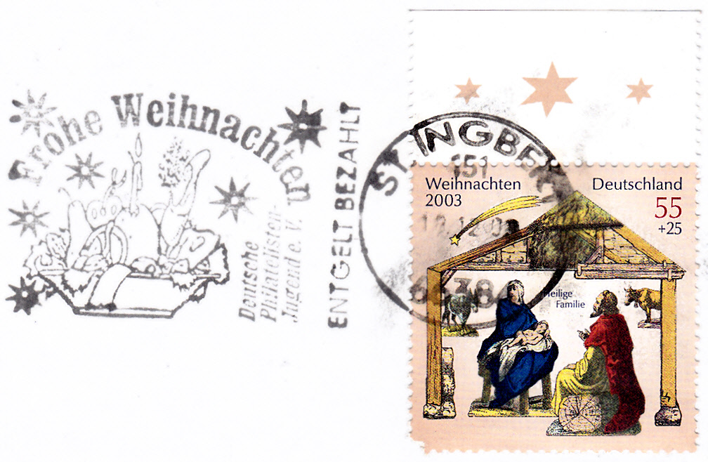 Absenderentwerterstempel der Deutschen Philatelisten Jugend e.V. mit Weihnachtswünschen vom 18.12.2003 aus St. Ingbert.
