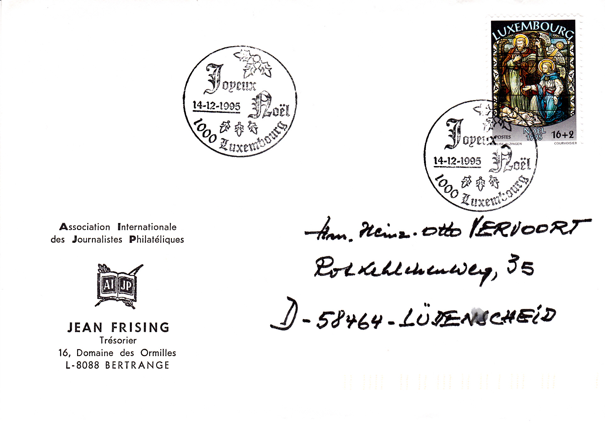 Weihnachtsgrüße in französisch finden wir auf diesem Stempel vom 14.12.1995 aus Luxemburg.