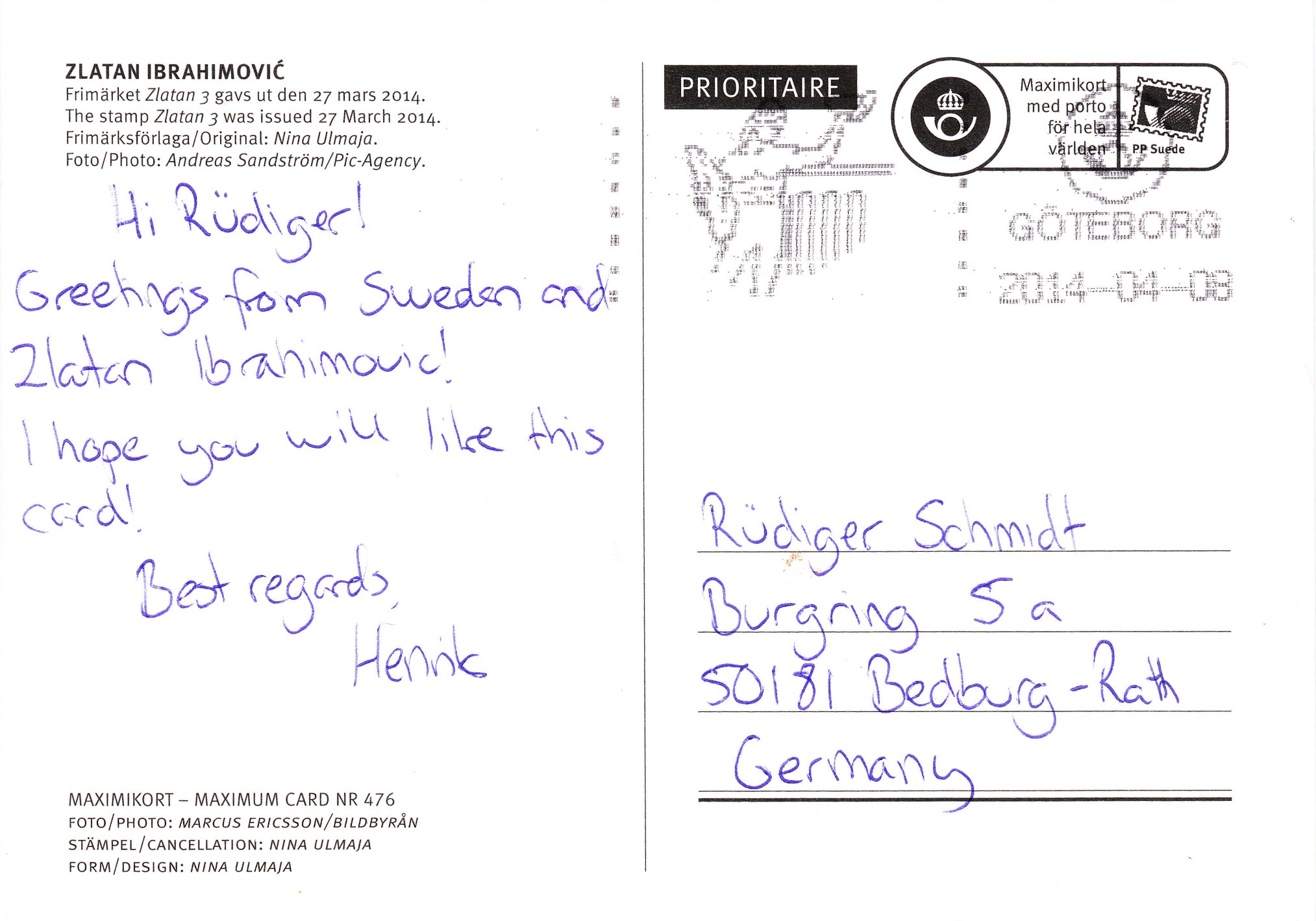 Die schwedische Post gab am 27.03.2014 in einer Auflage von 5 Millionen Stück diese Briefmarken-Kollektion mit gleich fünf verschiedenen Sondermarken zum Thema Zlatan Ibrahimović heraus.
