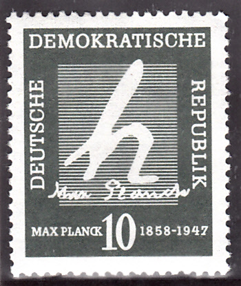 In der DDR erschien am 23.4.1958, dem 100. Geburtstag von Max Planck, diese Marke (MiNr 626) mit einem "h", dem Symbol für das Plancksche Wirkungsquantum und mit seinem Namenszug.